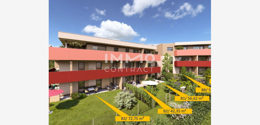 Vorraum, WC, Abstellraum, Bad, 2 Schlafzimmer, Wohn-Essküche (Küche nicht möbliert, Anschlüsse vorhanden), Terrasse/Loggia, Gartenanteil. Jeder Wohnung ist ein eigenes Kellerabteil zugeordnet. Die dargestellten Innenvisualisierungen sind als Musterbilder und Einrichtungsvorschläge zu verstehen, die Wohnungen sind schlüsselfertig/unmöbliert.