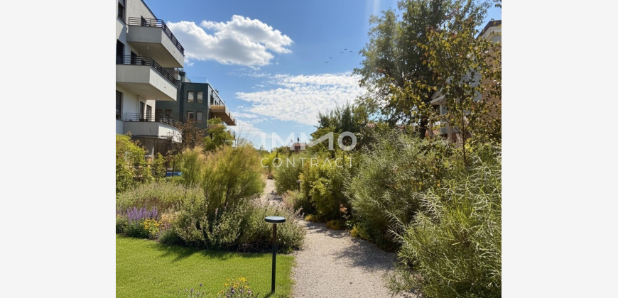 Eingebettet in die künstlerische Gartengestaltung von André Heller bieten die neuen Wohnungen einen großzügigen Blick in die weite Landschaft über die benachbarte Kleingartensiedlung. Das lebendige Farbenspiel der diversen Mosaikböden bei den Glashäusern und die mediterrane Bepflanzung im marokkanischen Garten schaffen eine harmonische Verbindung zwischen Architektur und Natur. Eine Allee aus Bambus bildet entlang der südlichen Grenze einen malerischen grünen Abschluss und eine geschützte Ruhezone für die Bewohner.