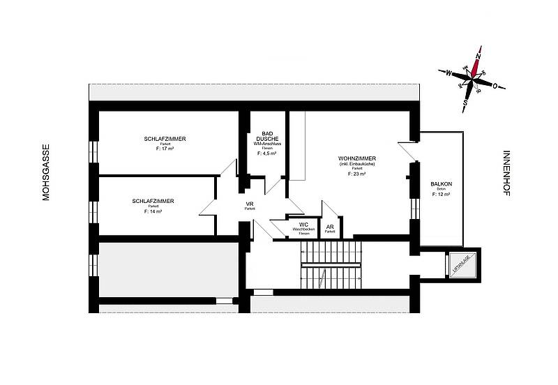 Sonniger 3 ZIMMER-Altbau + großer bzw. ruhiger Balkon 12m² + Einbauküche + Bad mit Dusche + extra WC mit Waschbecken + Lift + WG-tauglich + unweit vom Hauptbahnhof bzw. nähe FH-Joanneum!Auf einer Wohnfläche von ca. 68m² verteilen sich in der Mohsgasse unweit vom Hauptbahnhof bzw. nähe FH-Joanneum im 2. Obergeschoß mit Lift perfekt wie folgt: 3 Zimmer, davon 1 größeres Wohn- Esszimmer ca. 23m² mit großen bzw. ruhigen Balkon ca. 12m² und möblierter Einbauküche inkl. Geschirrspüler etc. - Innenhof (getr. begehbar), 2 sonnige Schlafzimmer ca. 17m² + ca. 14m² (beide Zimmer getr. begehbar), Abstellraum, Vorraum, Bad ca. 4,5m² mit Dusche / WM-Anschluss und Sprossenheizkörper, extra WC mit Waschbecken, Parkettböden, UPC- bzw. Telekom-Anschluss, Kellerabteil und die Wohnung wird mit Fernwärme beheizt (exkl. Heizung - wird direkt mit dem Anbieter abgerechnet).Die komplette Wohnung von der Malerfirma frisch ausgemalt, Parkettböden werden gereinigt bzw. aufbereitet, Sanitäranlagen (Bad + WC) werden vom Installateur überprüft, Elektrik bzw. Sicherungskasten werden überprüft usw. und nach Beendigung der Arbeiten wird die Wohnung noch von der Firma gereinigt!Günstige Parkmöglichkeit für Bewohner gibt es vor dem Haus in der "blauen Zone". Die Wohnung ist durch die sehr gute Aufteilung sowie zentrale Lage, optimal geeignet für ein Pärchen oder eventuell für eine 2er-WG (z.B. Studenten), da sie um Beihilfe ansuchen können (Wohnunterstützung).Sehr gute GVB-Verbindung mit der Straßenbahn: 1er, 4er, 6er, 7er und Bus: 53er, 58er, 62er, 63er mit Anbindung zum Jakominiplatz, FH-Joanneum, KF-Universität, Kunst- bzw. Musik-Universität, Campus Alte TU-Graz (Rechbauerstraße), Campus Neue TU-Graz (Steyrergasse), Campus TU-Inffeld (St. Peter), LKH-Graz, UKH-Graz usw.!Mietbeginn: 01.11.2025