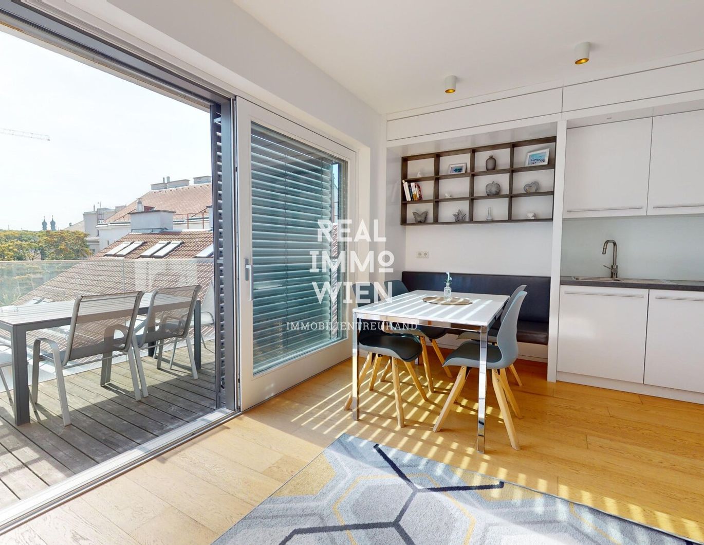 Dachfenster mit Außen Rollo ausgestattet (für Verdunklung) und Terrasse mit elektrische Raffstore