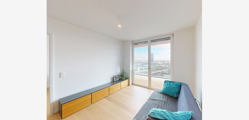 Die Wohnung ist Südöstlich (Vormittags- und Mittagssonne) ausgerichtet. Auf einer Wohnfläche von ca. 55m² verteilen sich Wohn-, Schlafzimmer, Badezimmer, Abstellraum und WC. Eine wettergeschütze XL-Terrasse mit ca. 18m² ist vom Schlaf- und Wohnzimmer mittels raumhoher Türen betretbar. Die Terrasse verfügt über Wasseranschluss und Steckdosen. Ein voll ausgestattete Küche (Backofen, Geschirrspüler, Kühl- & Gefrierkombination, Downdraft-Induktionskochfeld) ist bereits verbaut und im Preis inbegriffen. Auch die Möblierung kann optional ohne Aufpreis übernommen werden. Die Raumhöhe beträgt extra hohe 2.70m und gibt ein luftiges, dem Altbau ähnliches Raumgefühl. Sämtliche Wohnräume sind mit Fussbodenheizung bzw. Deckenkühlung ausgestattet, zusätzlich gibt es einen elektrischen Handtuchheizkörper im Badezimmer. Der Zustand ist Erstbezug .