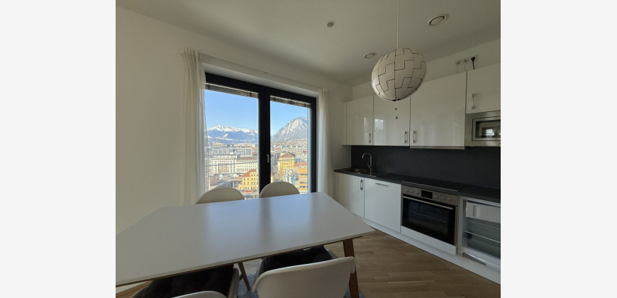 sowie den beeindruckenden Ausblick über die Stadt und die umliegende Bergwelt. Die Wohnung verfügt über eine Wohnfläche von 97,22 m² und gliedert sich in zwei getrennte Schlafzimmer, ein Wohn-/Esszimmer mit integrierter Küche, ein Badezimmer sowie ein separates WC. Der großzügige Eingangsbereich mit Gang erschließt alle Räume zentral. Die Wohnung wird voll möbliert vermietet. Große Fensterflächen sorgen für viel Tageslicht und ermöglichen einen freien Blick über Innsbruck bis hin zur umliegenden Bergkulisse und zur Bergisel-Schanze. Die