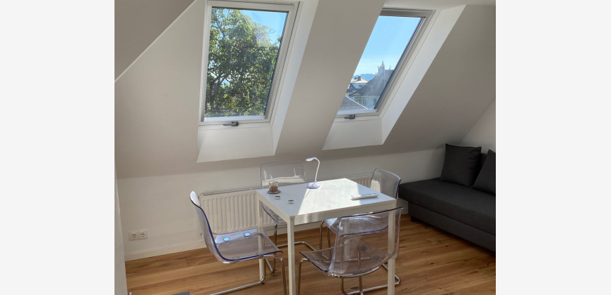 Lichtdurchflutete Mansardenwohnung für Romantiker/innen im Villenviertel von Bregenz IM DORF, in einem 100 Jahre alten Haus: Eine Wohnung für Romantiker/innen: Beim Einschlafen und Aufwachen kann man den Himmel sehen, tagsüber Baumkronen und die Schweizerberge. 2 Zimmer, zentraler Vorraum, Bad mit Badewanne , separates WC, Küche mit Geschirrspüler, Kühlschrank mit Gefrierfach, Backrohr. Auto- und Fahrradabstellplatz, Gartenbenützung (800m2). Busanbindungen ins Zentrum und zum Bahnhof, zu Fuß, in 5 Minuten im Wald, in 15 Minuten im Stadtzentrum, in 20 Minuten am See. Mit Auto in fünf Minuten auf der Autobahn in die Richtungen Deutschland und Schweiz.