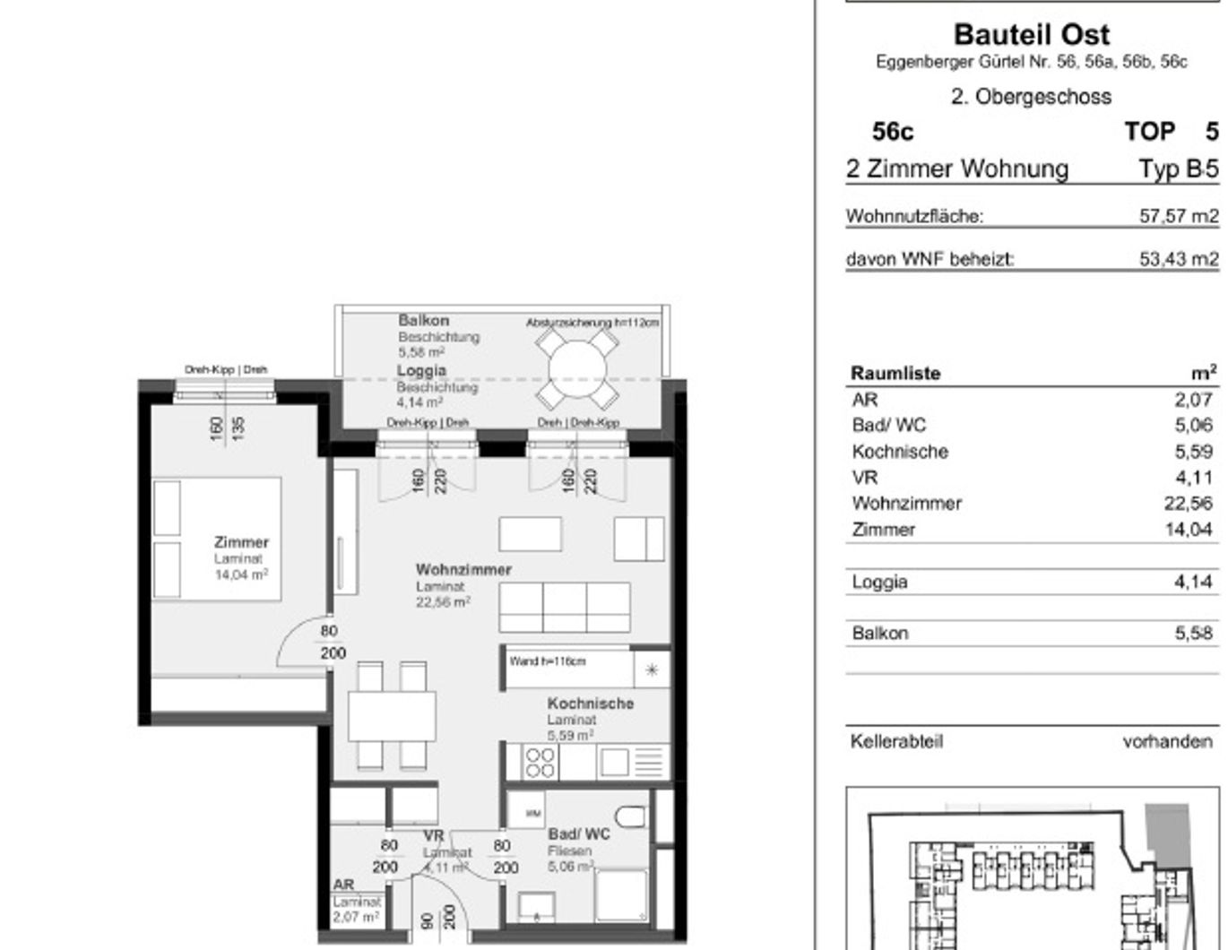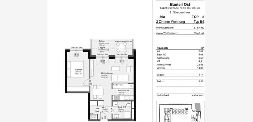 Diese ca. 57,57 m² große 2-Zimmerwohnung im 2ten Stockwerk gliedert sich in folgende Räumlichkeiten: