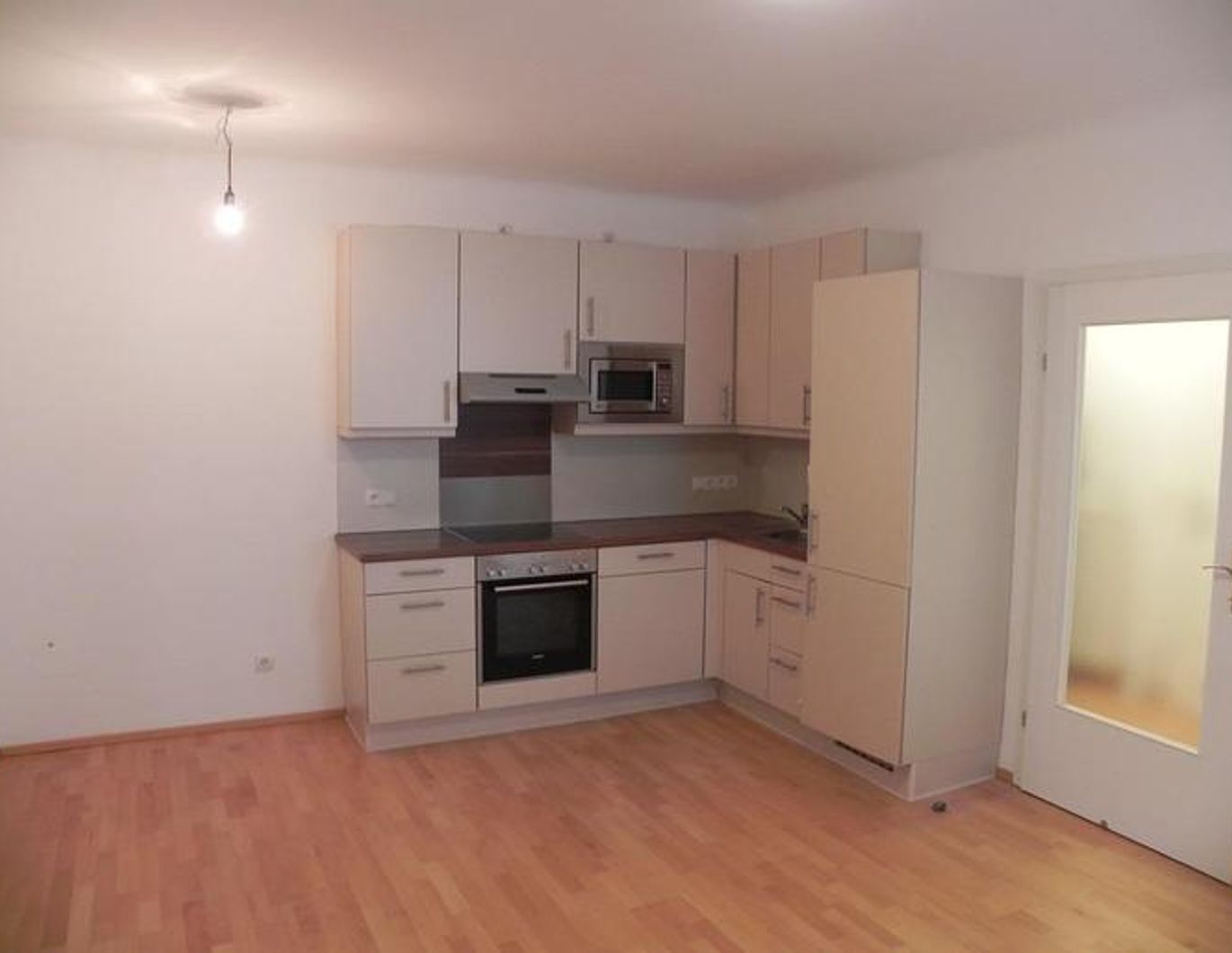 Vorraum, Wohnküche, 2 Schlafzimmer, Schrankraum, Bad, separates WC mit Handwaschbecken Ausstattung: Einbauküche komplett mit Geräten, Bad komplett eingerichtet, Parketten in den Wohnräumen, Nassräume verfliest, Vaillant Gas- Kombitherme, LED Beleuchtung in allen Räumen Sonstiges: Einbauküche komplett, Badezimmer komplett, Schrankraum mit Regalen