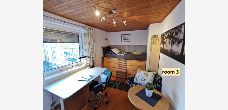 Room 3: approx. 12m² for 1 person, equipped with a clever storage bed (see photos), desk, wardrobe, bookshelves, comfortable seating area, parquet floor, 2 kinds of shutters.