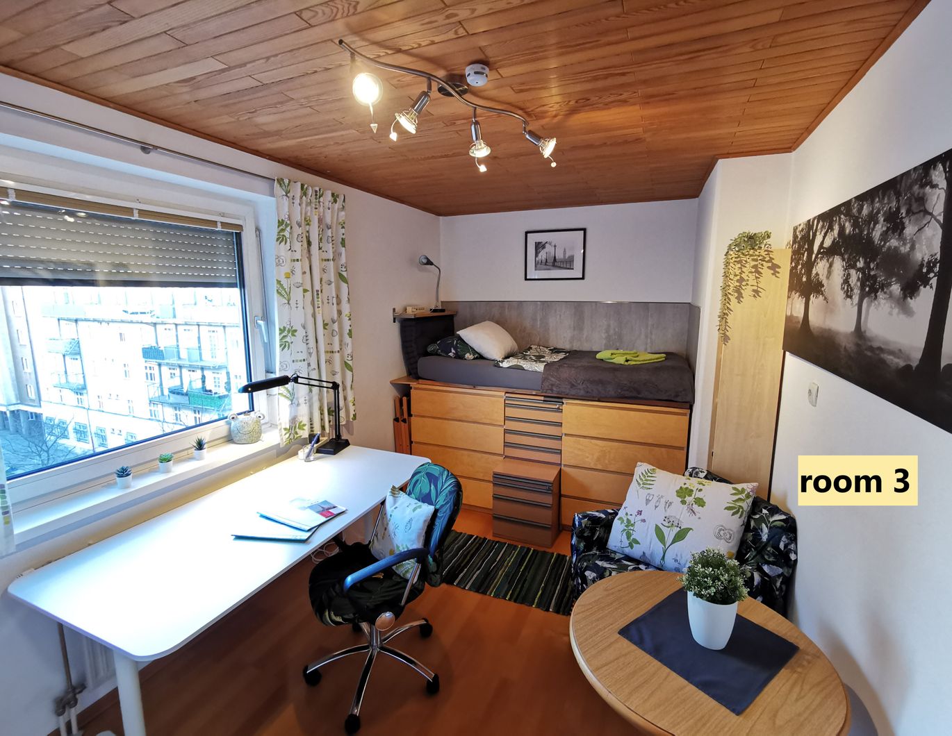 Zimmer 3: ca. 12m² für 1 Person, ausgestattet mit einem schlauen Stauraumbett (siehe Fotos), Schreibtisch, Kleiderschrank, Bücherregale, bequeme Sitzecke, Parkettboden, Innen- und Außenjalousien.