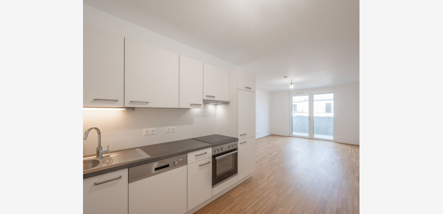 Zur Vermietung gelangt eine sehr großzügig gebaute 2-Zimmer Wohnung in urbaner Atmosphäre. Die helle Wohnung verfügt über einen Vorraum, ein modernes Badezimmer mit Badewanne und Waschmaschinenanschluss, ein separates WC, einen großzügigen Wohnbereich mit einer modernen, offenen Küche, einen Abstellraum, ein Schlafzimmer, sowie über eine Terrasse und einen Balkon. Die 3-fach-verglasten Fenster sind mit elektrischer Außenbeschattung ausgestattet. Die Wohnräume sind mit schönem Parkettboden ausgestattet und die Nassräume mit Fliesen verlegt. Bei Bedarf kann ein Garagenplatz in der hauseigenen Tiefgarage um monatlich EUR 99,- angemietet werden.