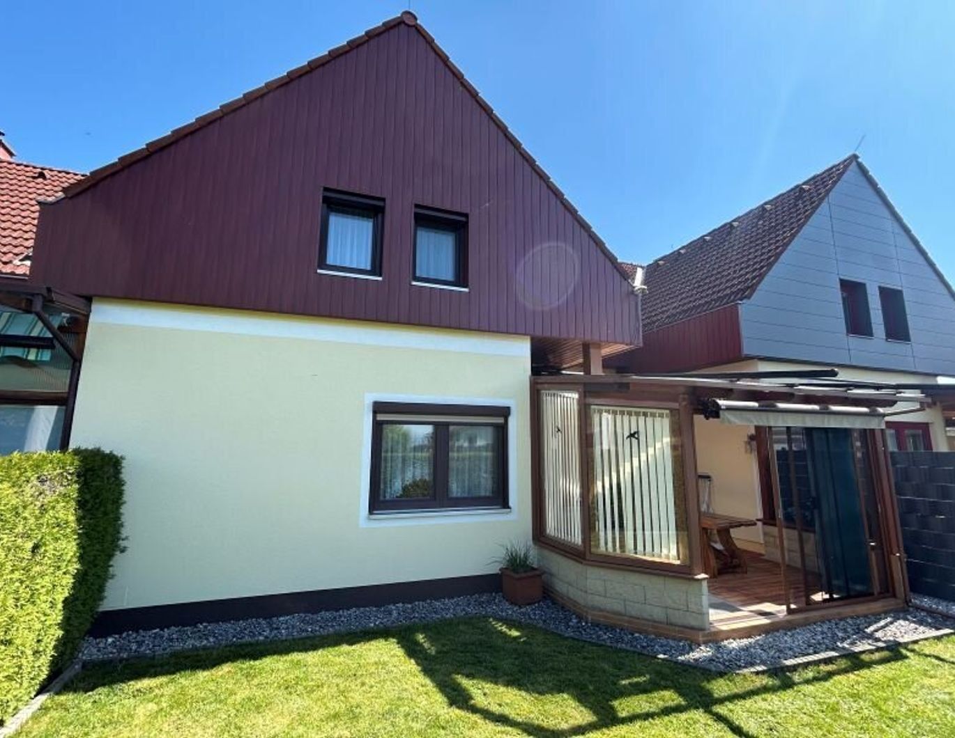 Das zum Verkauf stehende Reihenhaus wurde 1984 baubewilligt und bis 1988 als erster Bauabschnitt der Reihenhausanlage errichtet. Es verfügt über eine Wohnfläche von gesamt ca. 142 m² und wurde in Massivbauweise mit Satteldach errichtet. Um 2004 wurde die Terrasse mit einem großzügigen Wintergarten versehen.