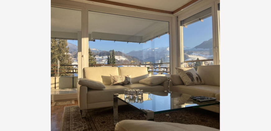 Das Highlight der Wohnung ist der durchgehende Alpenblick nach Osten, ergänzt durch ein sonniges Wohnzimmer nach Süden und kühle Schlafzimmer nach Norden