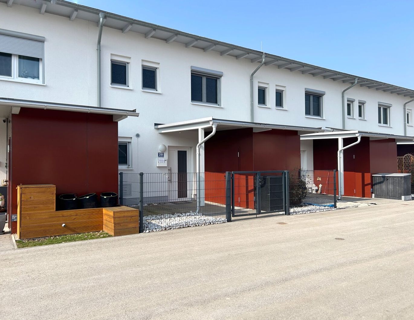DETAILINFORMATIONEN : Das Haus besticht durch ihre 13,63 m² Terrase und ihrer großzügigen Gartenfläche von ca. 55,85 m² . Ein Geräteraum , ein Garagenplatz sowie ein Parkplatz im Freien sind dem Reihenhaus zugeordnet.