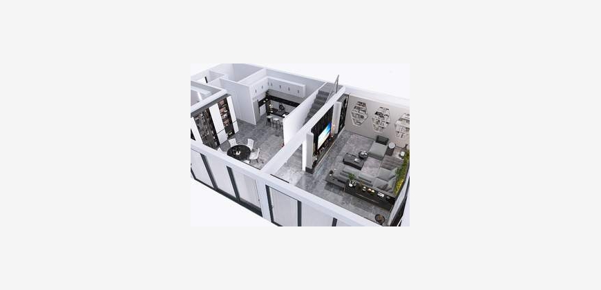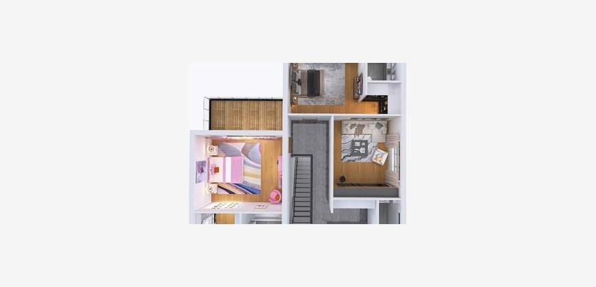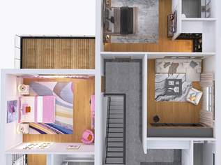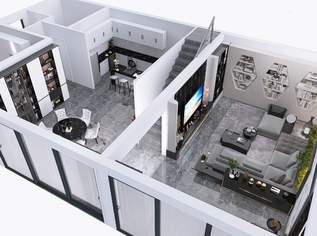 Erdgeschoss: Offene Küche mit Essbereich, angrenzender Wohnraum, zusätzliches Zimmer mit Gartenzugang (ideal als Gäste- oder Arbeitszimmer), Badezimmer mit Dusche & WC sowie Technikraum. Der Stiegenabgang mit integriertem Stauraum trennt Wohn- und Kochbereich geschickt voneinander.