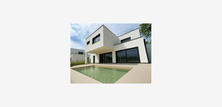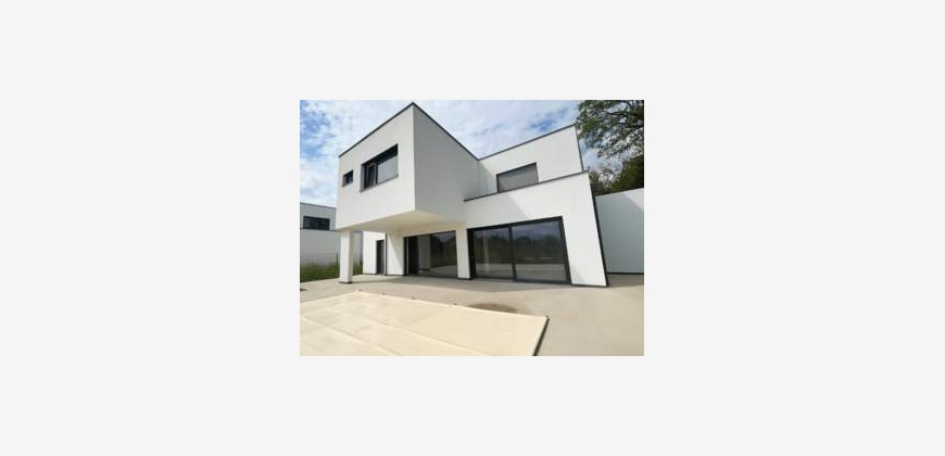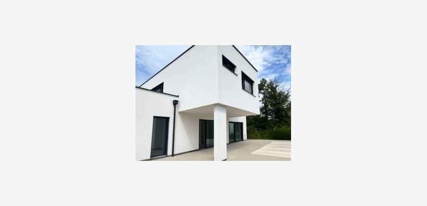 Das Haus wurde in Stahlbeton- und Ziegelmassivbauweise errichtet und überzeugt durch klare Linien, großzügige Fensterfronten und helle, offene Räume. Die Wohnfläche von ca. 180 m² verteilt sich auf zwei Ebenen.