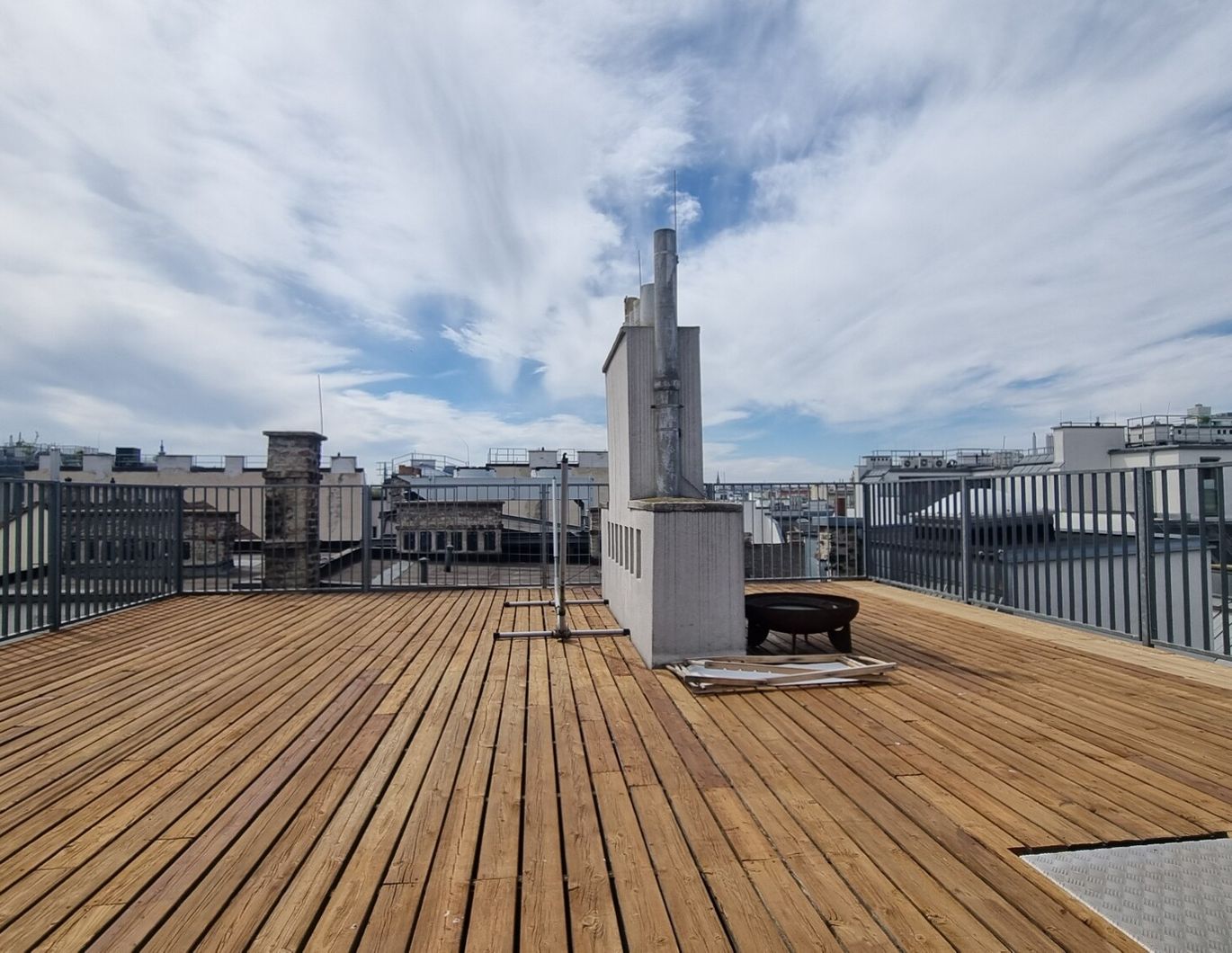 des 7. Bezirk, Ecke Mariahilferstraße und Neubaugasse, gelangt diese Dachgeschoß Wohnung zur unbefristeten Vermietung Vorzimmer, 49m² großer Wohnzimmer mit kompletter Küche, Terrasse straßen- und hofseitig, Abstellraum, Toilette, über eine Treppe gelangt man in den oberen Stock, in welchem sich 2 Schlafzimmer befinden, ein Designer Badezimmer mit Wanne, Dusche und WC, Abstellraum mit Anschluss für die Waschmaschine und begehbare Garderobe. Die große Dachterrasse bietet einen tollen Ausblick.