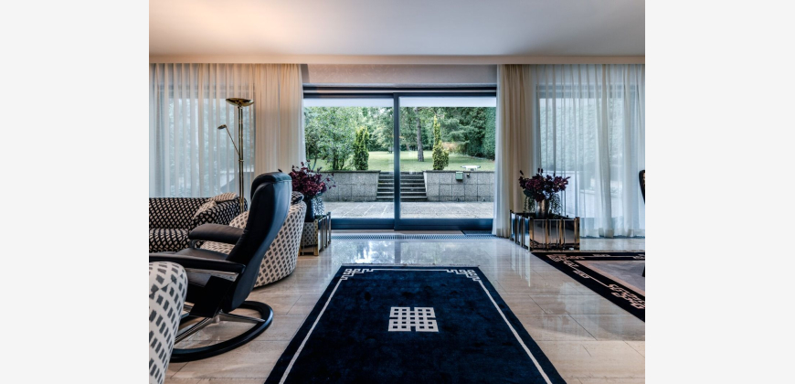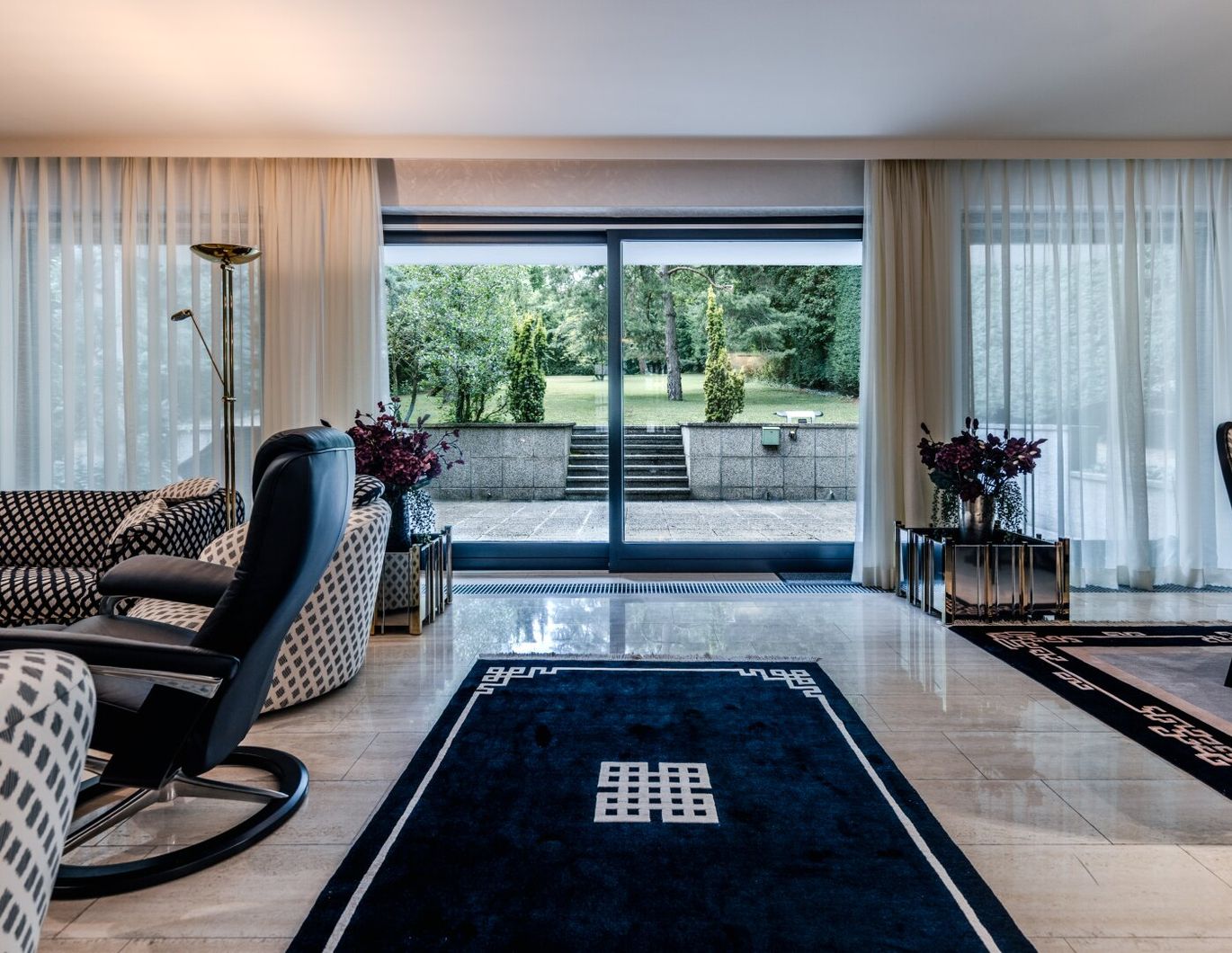 großer Salon (65 m²)mit offenem Kamin und großen Fensterflächen zur Terrasse und zum Garten