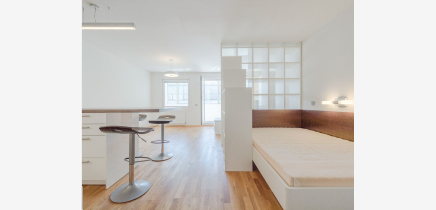 Diese sehr gepflegte Wohnung im 5. Liftstock bietet auf insgesamt rund 48m² Nettonutzfläche alles was das Herz begehrt und ist ab Februar beziehbar. Durch den Vorraum, betreten Sie den sehr offen gestalteten Wohn- und Essbereich mit voll ausgestatteter Küche (Geschirrspüler, Backrohr, Ceran-Kochfelder). Über den Vorraum erreichen Sie auf der linken Seite das Badezimmer mit Wanne, und das separate WC und auf der rechten Seite den Abstellraum mit eingebautem Safe. Durch hochwertige Tischlermöbel wurden im Wohnraum ein separierter Platz zum Schlafen, ein Arbeitsplatz und ein Eck für eine Sofalandschaft ermöglicht. Die Loggia bietet zusätzlichen Patz zum Lesen und Verweilen. Die Waschmaschine hat ihren Platz in der Küche gefunden. Einen Ess- und Arbeitsbereich bietet die großzügige Bar in der Küche. Die hohen Fenster vermitteln ein luxuriöses Wohngefühl und machen die Wohnung in Verbindung mit der hohen Stockwerkslage sehr hell und freundlich. Die Warmwasseraufbereitung und die Beheizung der Wohnung erfolgen über eine Hauszentralheizung. Die monatlichen Kosten für Warmwasser und Heizung sind in der inserierten Miete in Höhe von € 956,92 bereits inkludiert!