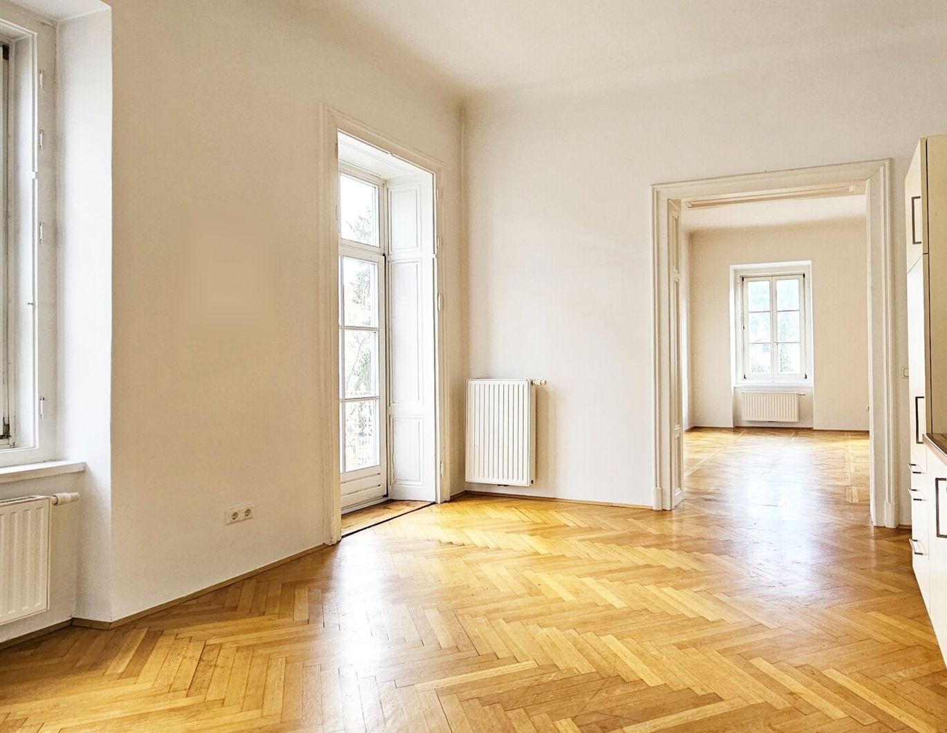 Da die 3 Zimmer extra begehbar sind, ist die Wohnung auch perfekt für eine 3-er WG geeignet. In der geräumigen Küche ist Platz für einen Essbereich.