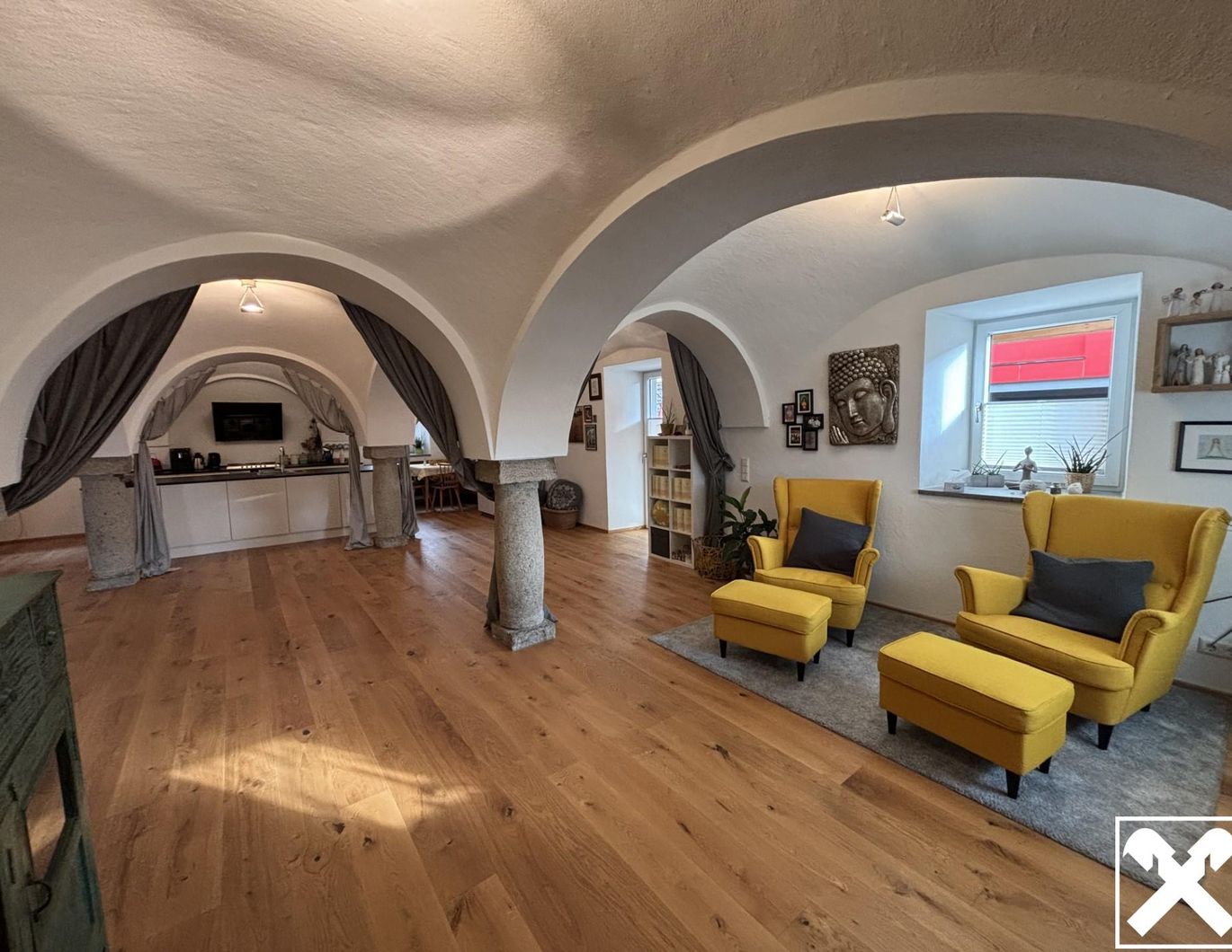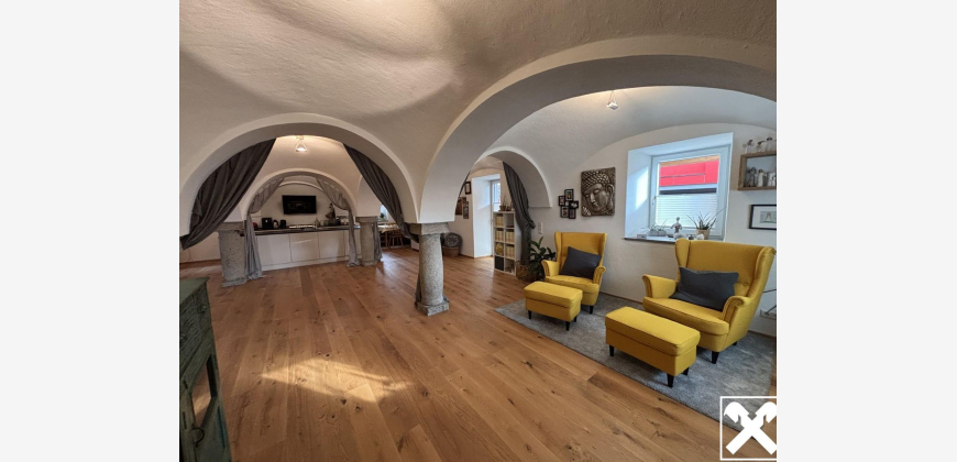 und ein besonderes Wohnambiente. Es umfasst einen Vorraum, einen großzügigen offenen Wohnbereich mit Küche, Ess- und Wohnzone, ein Schlafzimmer, ein separates WC sowie ein abgetrenntes Badezimmer mit Dusche. Die Küche ist funktional ausgestattet und verfügt über einen Geschirrspüler, ein Backrohr sowie ein fünf-flammiges Gaskochfeld. Weiße Küchenfronten in Kombination mit einer Arbeitsplatte aus schwarzem Granit verleihen dem Raum eine elegante Optik. Ebenfalls im Untergeschoss befindet sich der Technikraum, dessen Fußbodenniveau etwa 1,5 Meter unter dem Niveau des restlichen Geschosses liegt. Ein besonderes Highlight stellt das beeindruckende Kreuzgewölbe mit vier Granitsäulen im offenen Wohnbereich dar, das dem Raum einen einzigartigen Charakter verleiht. Für angenehme Wärme sorgt die vorhandene Fußbodenheizung, die zusätzlich durch einen stilvollen Gusseisenofen ergänzt wird.