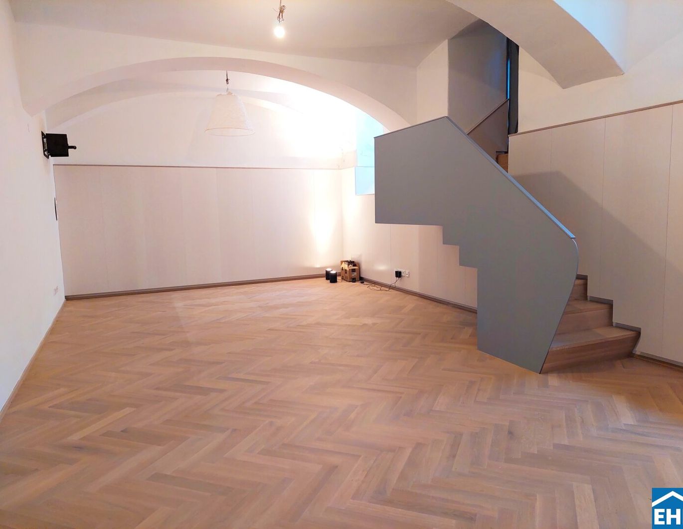 Von der Schelleingasse aus gelangt man über eine Treppe in das etwa 43 m² große Geschäftslokal im Souterrain. Die Wände dieses Raumes wurden mit einer weiß lasierten, mannshohen Holzverschalung verkleidet. Der Zwischenraum zum Mauerwerk ist mit einer maschinell betriebenen Hinterlüftung versehen. Durch einen Gang ist dieser Geschäftsraum mit den Nebenräumen