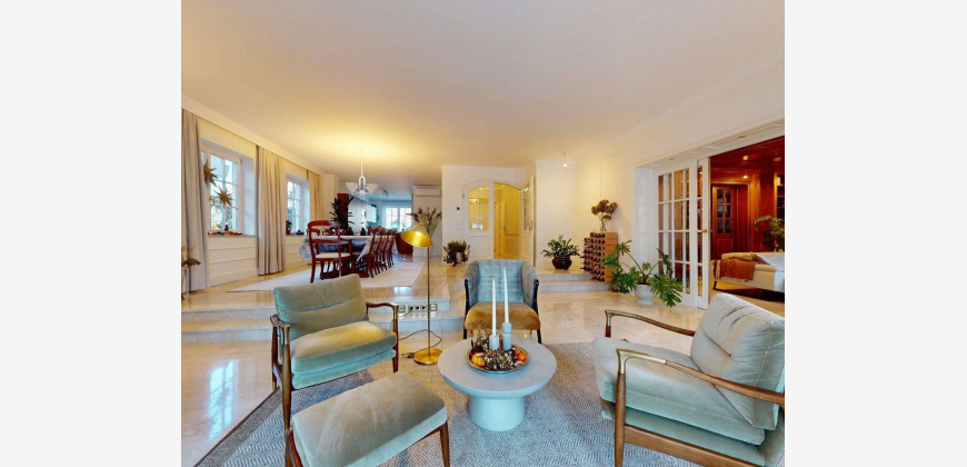 Bereits das Entree mit Garderobe und der repräsentativen Treppe ins Obergeschoss vermittelt den eleganten Charakter des Hauses. Das Herzstück der Villa ist der weitläufige, lichtdurchflutete Wohn- und Essbereich mit Wintergarten . Große Glasflächen eröffnen einen herrlichen Blick in den Garten und schaffen eine fließende Verbindung zwischen Innen- und Außenraum. Die neue, moderne Küche ist mit hochwertigen Miele-Markengeräten ausgestattet und ideal für alle, die Wert auf Qualität und Design legen. Vom Wohnbereich gelangt man direkt auf die sonnige Südterrasse mit Pool und Außendusche