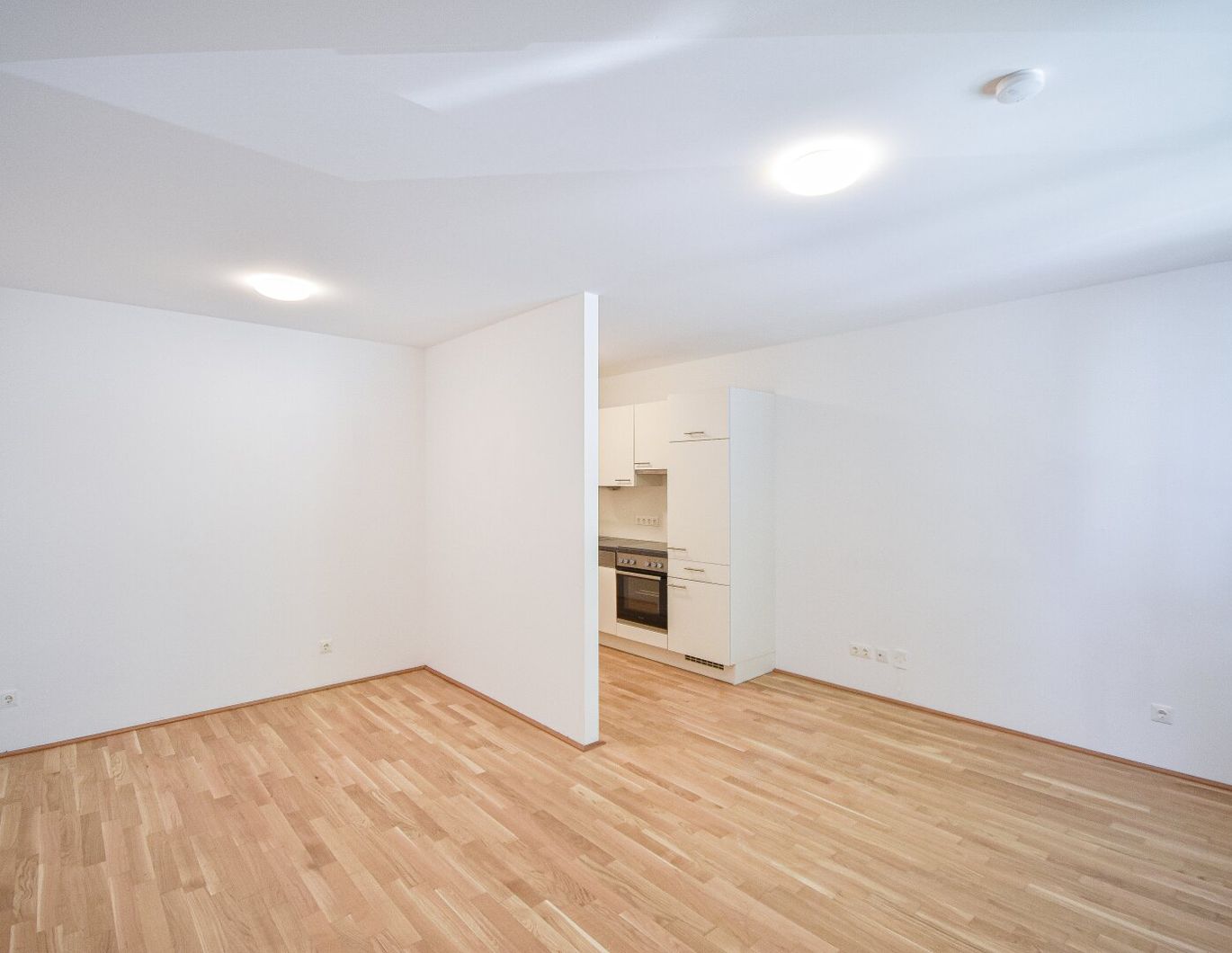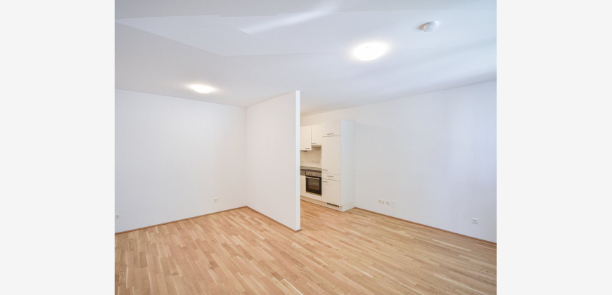 Ab sofort gelangt zur Vermietung eine 1,5-Zimmer Wohnung in urbaner Atmosphäre. Die helle Wohnung verfügt über einen Vorraum, ein modernes Badezimmer mit Dusche, Waschmaschinenanschluss und WC, einen Wohnbereich mit einer modernen, offenen Küche, sowie über eine Loggia. Die 3-fach-verglasten Fenster sind mit elektrischer Außenbeschattung ausgestattet. Die Wohnräume sind mit schönem Parkettboden ausgestattet und die Nassräume mit Fliesen verlegt. Bei Bedarf kann ein Garagenplatz in der hauseigenen Tiefgarage um monatlich EUR 99,- angemietet werden.