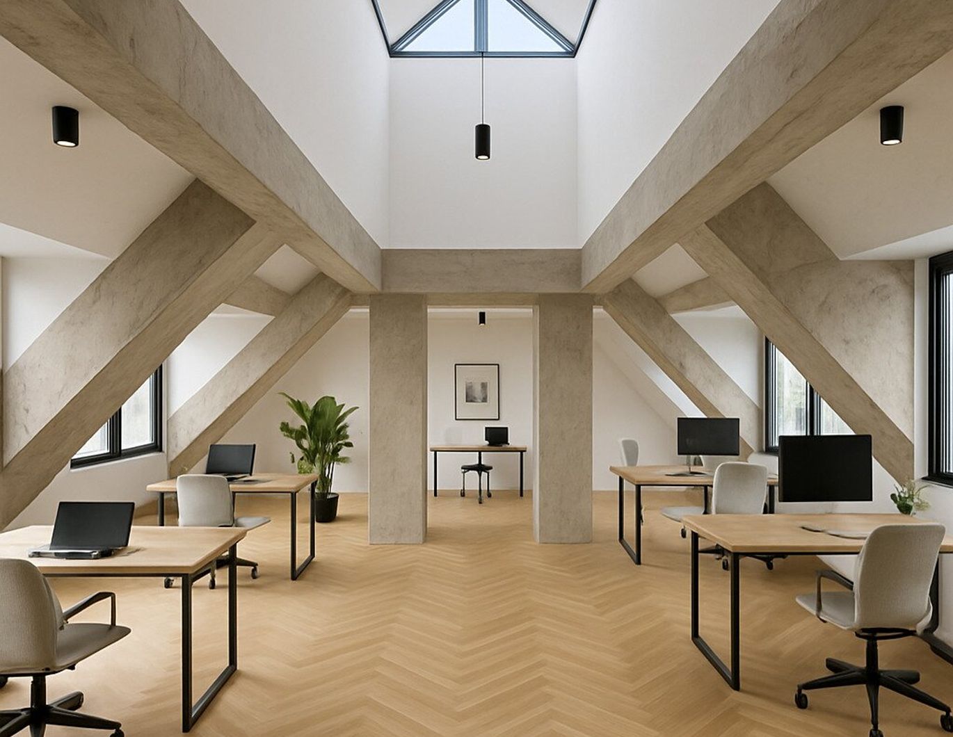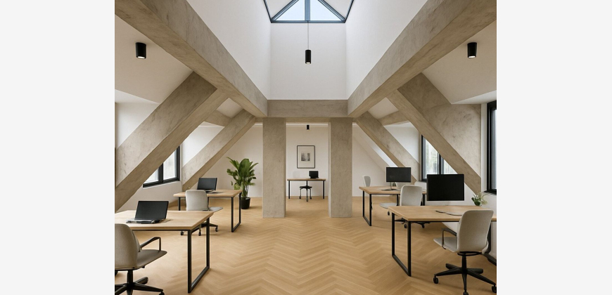 Dieses großzügige Büro befindet sich im Dachgeschoss und erstreckt sich über rund 457 m², verteilt auf zwei Ebenen. Derzeit befindet sich die Fläche im Rohbau-Zustand