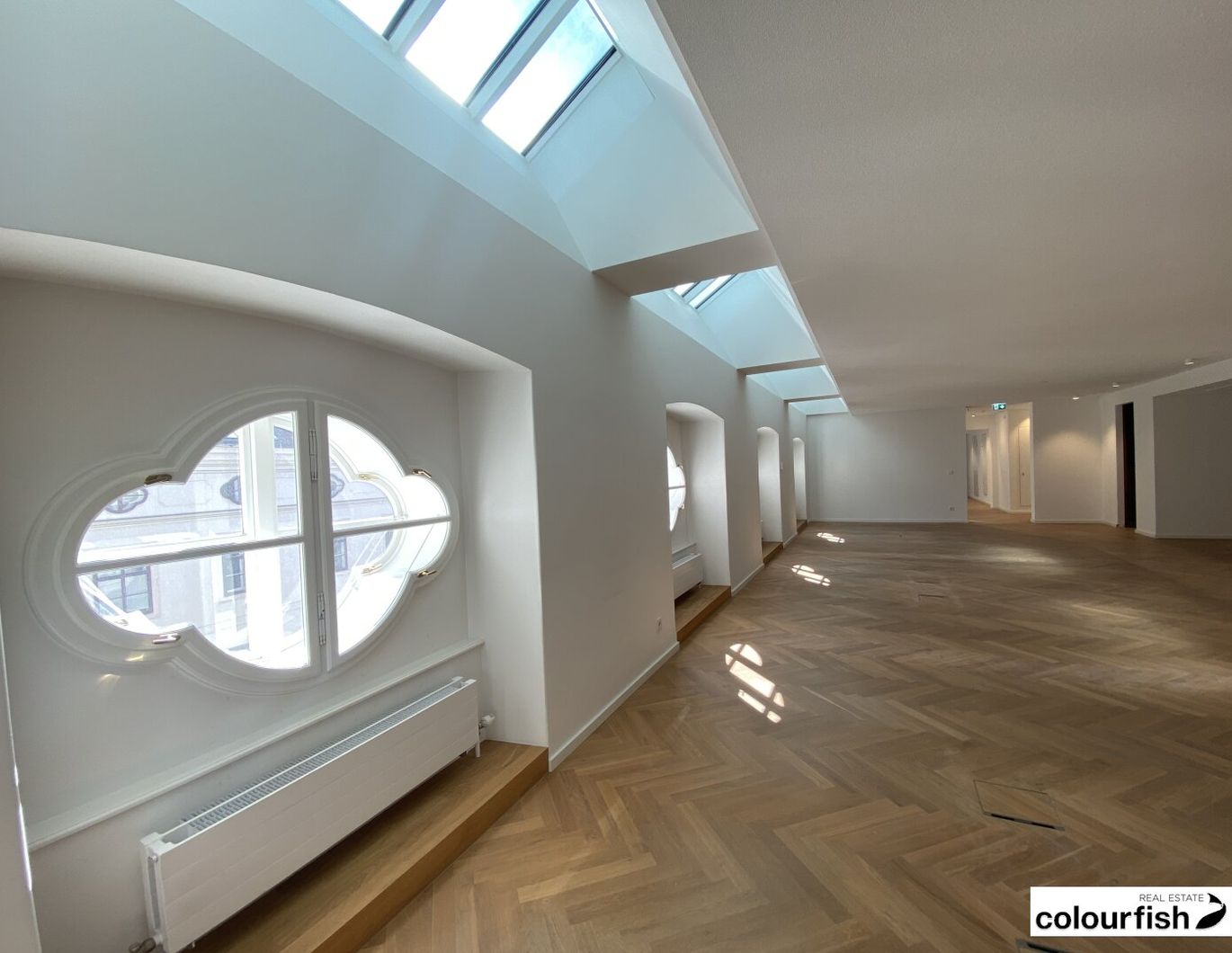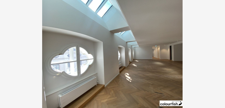 In die Vermietung gelangt eine ca. 1.039 m² große Bürofläche im repräsentativen Palais Harrach an der Freyung. Die Fläche befindet sich im 3. Obergeschoss und ist über drei unterschiedliche Lift-Stiegenhäuser erreichbar. Der aktuelle Grundriss gliedert sich in mehrere offenere Bereiche. Der Grundriss ist grundsätzlich flexibel, sodass einzelne Büroräume geschaffen werden können. Durch die
