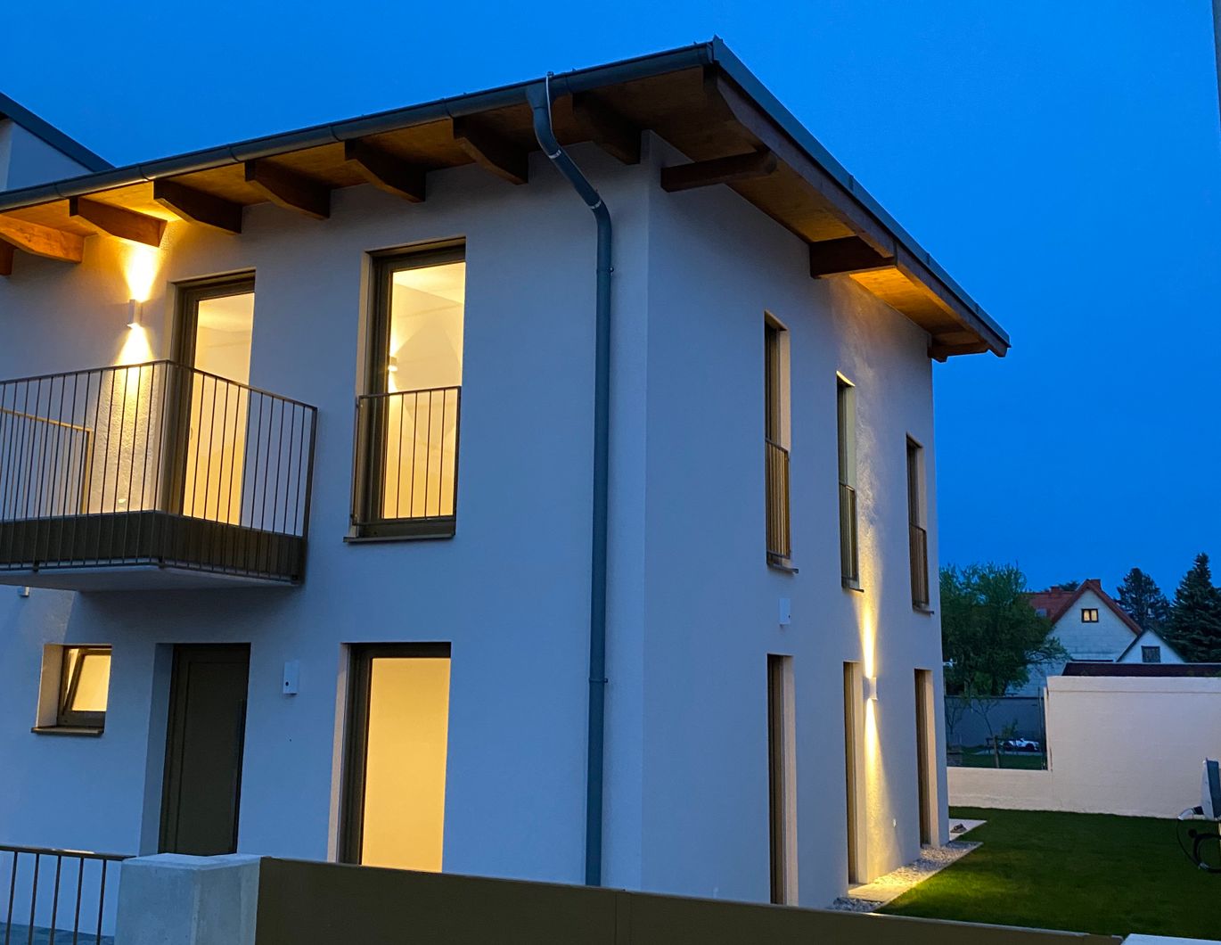 Die Ausstattung der exklusiven Architekten Häuser beinhaltet unter anderem eine Luftwärmepumpe von Vaillant, Raffstores, Hebeschiebetüren, Aluminiumfenster und ein durchdachtes Lichtkonzept.