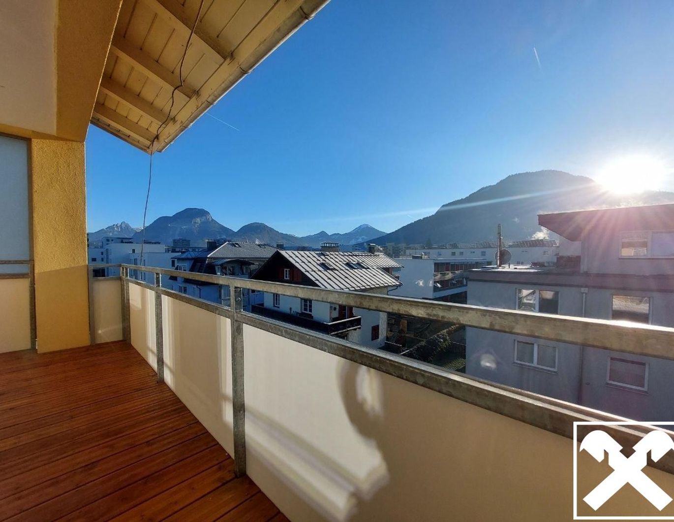 Zwei Balkone mit Süd- und Ostausrichtung laden zum Verweilen ein und bieten traumhafte Ausblicke auf die umliegende Bergregion und viel Sonne .