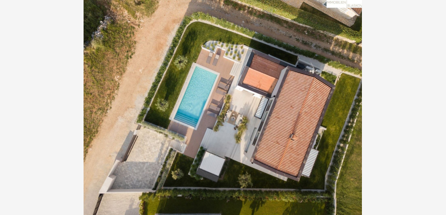 auf einem Grundstück mit 914 m2 errichtet. Auf zwei Etagen mit rund 180 m2 Fläche und einem großzügigen Außenbereich mit jahrhundertealten Olivenbäumen bleiben keine Wünsche für ruhesuchende Menschen offen. Umgeben von Natur und ausgedehnten Grünflächen ist Ruhe und Anonymität garantiert. Im Erdgeschoss finden ein offener Wohnbereich, der Wellnessbereich mit Sauna sowie Sanitäranlagen, Garderobe, Technikraum für die Zentralheizung und ausreichend Stauraum für Gegenstände des täglichen Bedarfs Platz. Das Obergeschoss mit 3 Schlafzimmern und jeweils eigenen Badezimmern ist für 6 Personen ausgerichtet. Die hochwertige Bauweise mit 10 bzw. 15 cm Fassadendämmung, PVC-Fenstern, Aluminium-Sonnenschutz, modernen Glasschiebetüren, wasserbasierter Fußbodenheizung mit Mitsubishi-Wärmepumpe, Klimaanlagen, wandbündigen Türen, Microtopping-Bodenbelägen, italienischen Möbeln und Beleuchtungskörper, sowie eine generell hochwertige Ausstattung im Innen- un Außenbereich sind die Highlights dieser großartigen Villa. Im mediterranen Garten, welcher durch eine Mauer eingefriedet ist, sind der beheizte Swimmingpool (ca. 40 m2), die Sonnenterrasse und der überdachte Essbereich mit Sommerküche und Kamin geplant. Hier werden Sie die schönsten Stunden des Jahres mit Familie und Freunden verbringen und die untergehenden Sonne genießen.