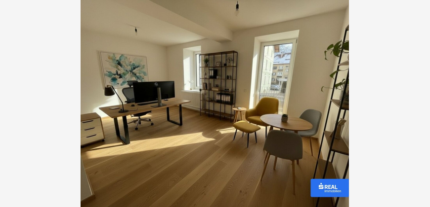 mit einem Ess-/Wohnbereich, einem Schlafzimmer sowie einem Badezimmer mit Dusche und WC. Sowohl die Räume als auch der ca. 4,5 m² große Balkon, der direkt vom Ess-/Wohnraum aus zugänglich ist, sind südseitig ausgerichtet und laden zu gemütlichen sowie produktiven Momenten ein. Die moderne und funktionale Gestaltung schafft ein angenehmes Ambiente. Hochwertige Naturböden sowie ein durchdachtes Lichtkonzept unterstreichen den zeitgemäßen Charakter der Einheit und sorgen für Komfort und Qualität auf hohem Niveau. Aufgrund der entsprechenden Flächenwidmung ist die Einheit nicht nur als Mietwohnung, sondern auch ideal als Büro oder Ordination nutzbar und bietet damit flexible Einsatzmöglichkeiten in zentrumsnaher Lage. Ideal geeignet für Singles, Paare, Pendler, Berufstätige, Geschäftsreisende oder Alleinerziehende sowie für Personen oder Unternehmen, die ein zentrumsnahes Objekt mit hoher Wohn- und Arbeitsqualität schätzen.