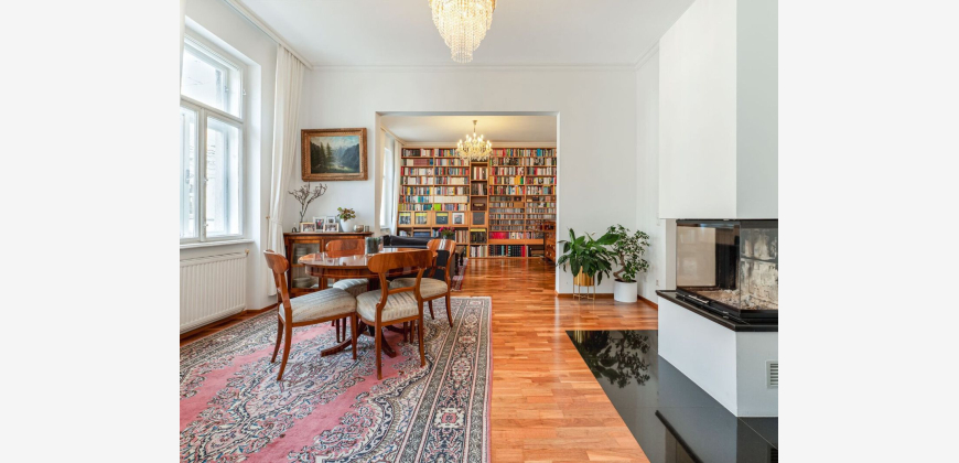 Die Wohnung befindet sich im 2. Stock (der Lift-Einbau ist bereits geplant und befindet sich in Einreichung) und ist nord-süd-seitig ausgerichtet, wodurch sie angenehm sonnig und hell ist. Man betritt die 4-Zimmer-Wohnung und befindet sich im geräumigen Vorzimmer, von welchem aus sämtliche Räume teilweise zentral begehbar sind. Hier findet man durch einen praktischen Einbauschrank ausreichend Staufläche. Direkt vom Vorraum aus gelangt man in das wunderschöne Badezimmer, welches mit einer Badewanne mit Regendusche, einem Doppelwaschtisch sowie einer Toilette ausgestattet ist. Das Herzstück dieser Wohnung stellt wohl der gemütliche Wohnsalon mit einem offenen Kamin dar. Auf einer Größe von 19,44 m² finden die neuen Eigentümer genügend Möglichkeiten für eine bequeme Couch, einen großen Esstisch sowie eine gemütliche Leseecke neben dem Kamin. Der zweite Wohnbereich ist offen vom Kaminzimmer zu begehen und bietet auf 19,53 m² ausreichend Platz, um diesen schön zu gestalten. So kann man eine komfortable Sitzgarnitur sowie TV-Möbel gekonnt platzieren. Die perfekt modern gestaltete Küche ist über das Vorzimmer zu erreichen und offeriert auf rund 10,50 m² genügend Staufläche für Kochutensilien. Die hochwertigen Marken-Geräte sowie die zeitlosen Oberflächen unterstreichen die wertvolle Ausstattung. Von hier aus ist der mit Nussholz vertäfelte Pub als Verlängerung der Küche zu begehen. Hier kann man entspannt das Frühstück genießen bzw. gemütliche Abende herrlich ausklingen lassen. Anschließend befindet sich hier auch die separate Toilette. Der Master-Bedroom hat ein Ausmaß von ca. 19,50 m²