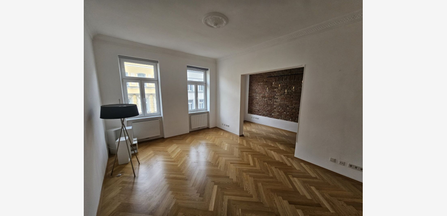 Vom großzügigen Vorraum aus sind alle Zimmer der Wohnung getrennt begehbar : Wohnzimmer (20 m²) mit Esszimmer (11 m²) (Wohnzimmer und Esszimmer sind durch einen größeren offenen Durchgang verbunden, Küche (8 m²), zwei Schlafzimmer ( 10 m² (hofseitig) + 21 m² (Jahngasse), Bad (4 m²) und WC (1 m²).