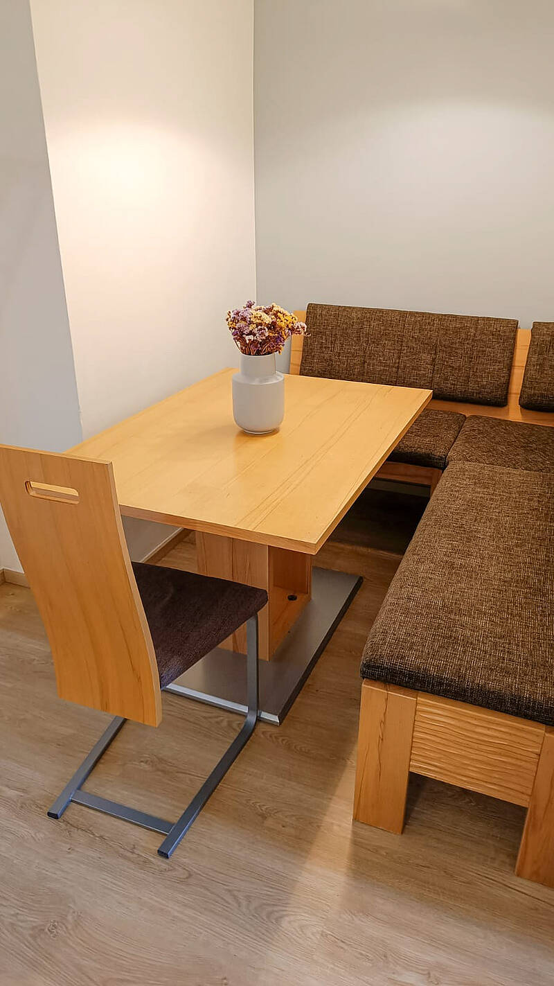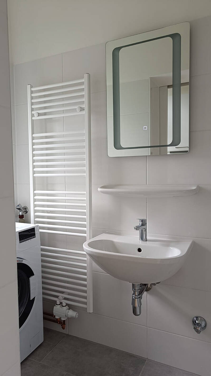 Über einen freundlichen Gang können alle Zimmer betreten werden. Es gibt genug Platz für Garderobe. Am Ende liegt der gemütliche Essplatz mit ausziehbarem Tisch.Die Küche hat ein Fenster zum Garten. Die funktionale Einbauküche ist mit Geschirrspüler, E-Herd mit Backofen und Dunstabzug und einem Kühlschrank mit eigenem Gefrierfach ausgestattet.Das Bad ist ganz neu und hat ein Fenster zum Garten! Das Bad hat ein Waschbecken,