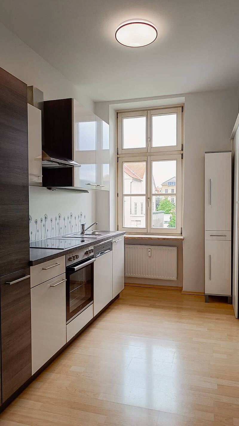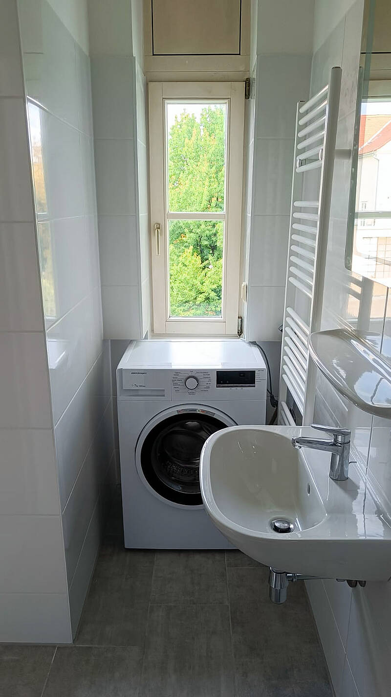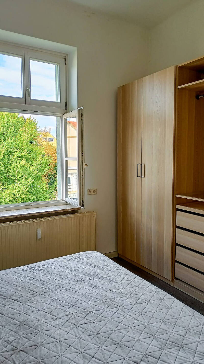 eine großer Dusche, einen Spiegel mit Beleuchtung, einen Handtuchtrockner und eine neuwertige Waschmaschine. Das getrennte WC liegt am Gang.Die drei Wohnräume haben unterschiedliche Größen. Zimmer 1 liegt gartenseitig und ist mit einem neuwertigen Schlafzimmer möbliert. Platz für Schreibtisch ist vorhanden.Das Zimmer 2 liegt straßenseitig und ist der größte Raum. Durch die Doppelfenster ist es sehr hell und auch bestens als Wohnzimmer geeignet. Eine blaue Couch mit Schlafmöglichkeit und eine schöne weiße Kommode gehören zur Ausstattung! Der Raum kann durch eine moderne ferngesteuerte Deckenleuchte individuell beleuchtet werden.Das Zimmer 3 bietet durch das eingebaute Hochbett und einen dreiteiligen Schrank reichlich Platz für verschiedene Verwendungsmöglichkeiten. Das große Fenster schaut zur Straße und bietet wie Zimmer 2 Nachmittagssonne.TV-SAT-Anschluss ist vorhanden. Zur Wohnung gehört auch ein Kellerabteil.Der Gemeinschaftsgarten im ruhigen grünen Innenhof darf von den Mietern genützt werden. Die Fahrräder können im Innenhof sicher abgestellt werden.Diese Wohnung wird für € 850,- inkl. Betriebskosten und MwSt. angeboten.
