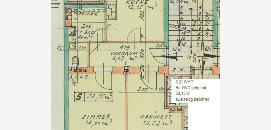 Die Wohnung hat drei Zimmer bei gesamt nur 53,15 m². Zwei grosse Zimmer mit Blick auf den gegenüberliegenden Park (Schlafen oder Wohnen) und eine Wohnküche mit Blick zum grossen Innenhof. Ein Vorraum mit Garderobe und getrennte Räume für Bad und WC mit jeweilig eigenem Waschbecken runden das ideale Nutzungsangebot ab. Die