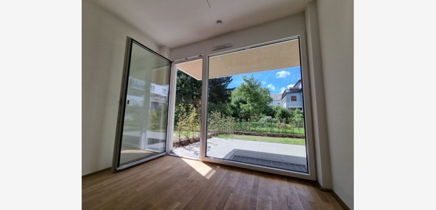 Die Wohnung besticht besonders durch ihre hochwertige Ausstattung und die perfekte Raumaufteilung, welche aus einem geräumigen Vorraum, dem großem Wohn-/ Essbereich mit moderner Küche, zwei Schlafzimmer sowie einem Badezimmer mit einer ebenerdigen Dusche und einem getrennten WC besteht. Vom Wohnzimmer sowie von einem Schlafzimmer aus gelangt man auf die rund 14 m² große Terrasse und anschließenden rund 50 m² großen Eigengarten der Wohnung, welche zum Entspannen im Freien einlädt. Fenster- und Glasflächen, welche die Wohnung mit Tageslicht durchfluten, schaffen ein sehr angenehmes Wohnambiente.
