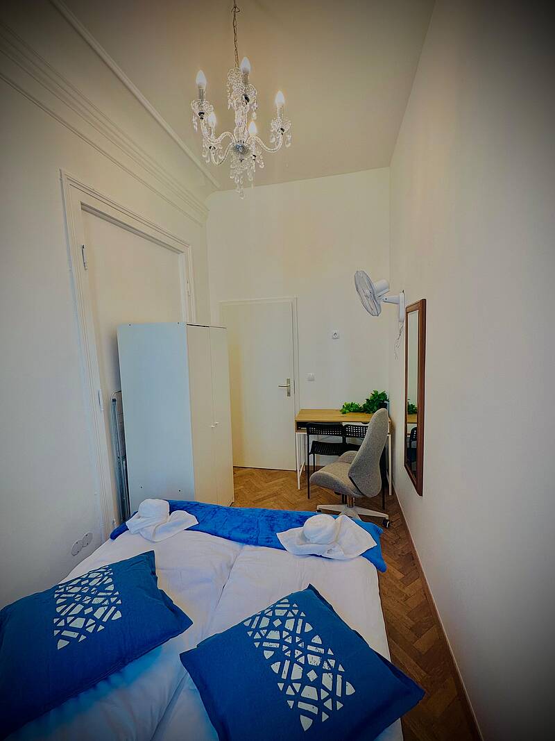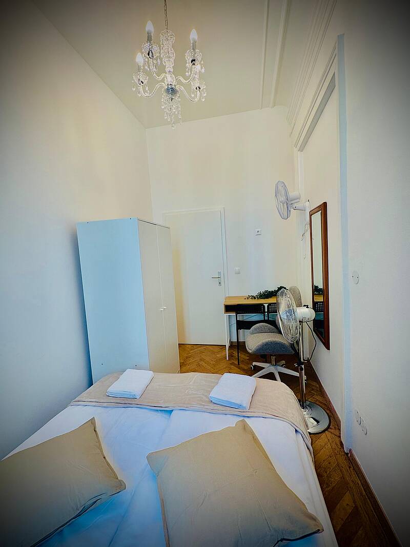 Die Zimmer sind ab sofort zu vermieten, die Miete für eine Person pro Monat beträgt 550€, für zwei 600€ im größeren Zimmer. Doppelbett, Kasten, Schreibtisch und Sessel sind inklusive, sowie zwei Bäder und drei WCs für alle.