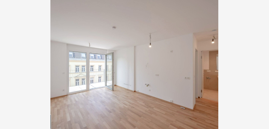 Die gut geschnittene Zweizimmer-Wohnung wurde kürzlich fertiggestellt und ist nun als ERSTBEZUG sofort beziehbar. Die Neubauwohnung im 5. Liftstock teilt sich auf in einen kleinen Vorraum mit Garderobennische, praktischen Abstellraum und eine Wohnküche mit Zugang zum sonnigen Balkon. Über die Wohnküche ist weiters das gemütliche, rd. 13m² große Schlafzimmer, das Badezimmer und das getrennte WC begehbar. Die Wohnung ist straßenseitig, zur Längenfeldgasse hin, ausgerichtet. Aufgrund der hohen Stockwerklage und der südwestlichen Ausrichtung ist die Wohnung hell.