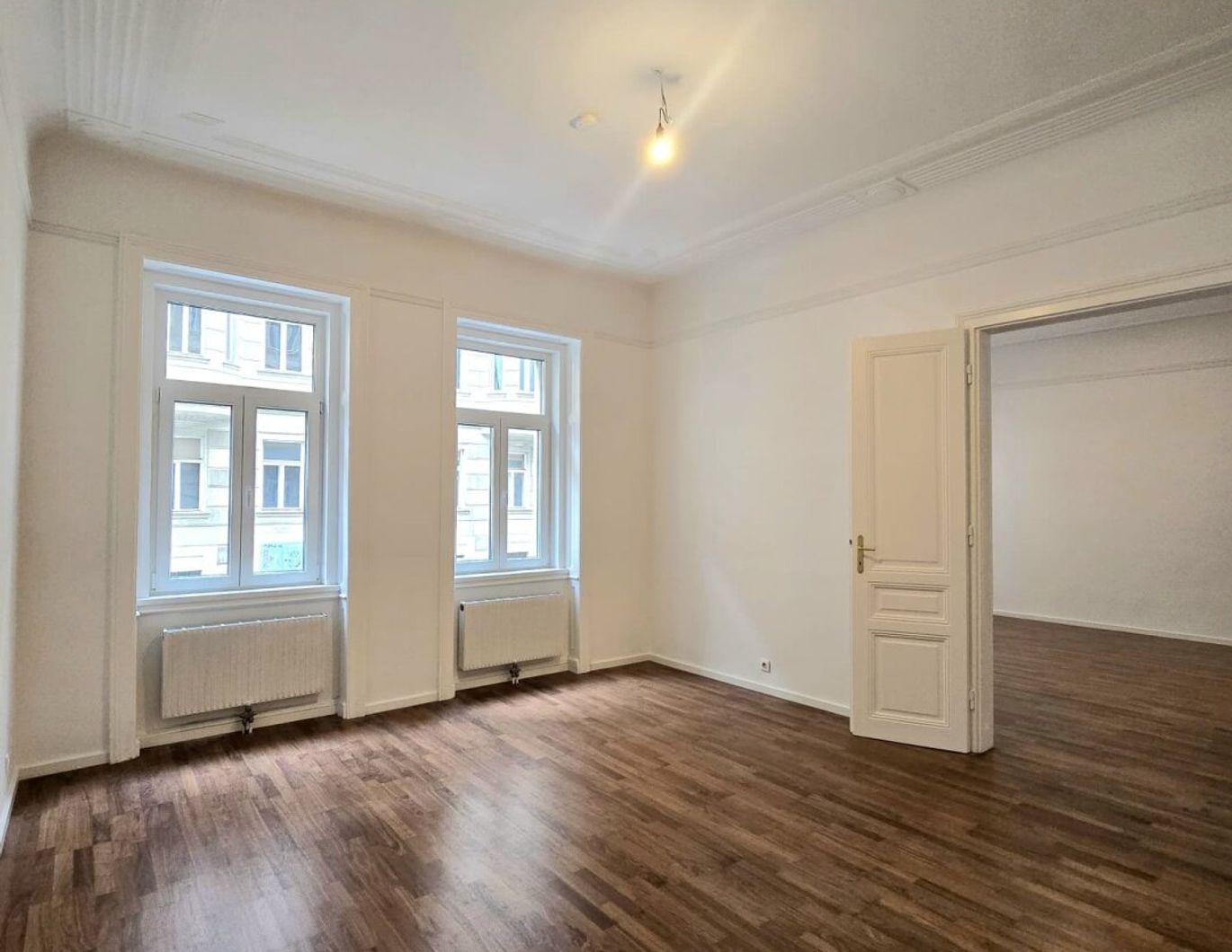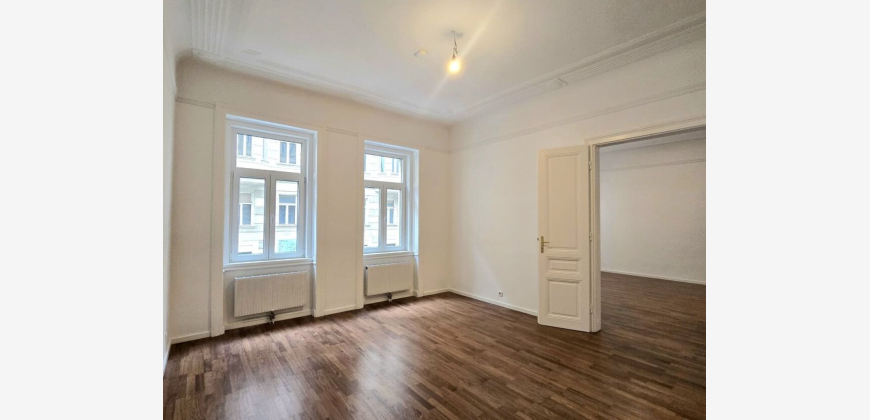 zwei , sehr geräumigen getrennt begehbaren Zimmern einer offenen Küche mit Platz für einen Esstisch, Badezimmer mit Wanne, Waschbecken und hofseitigen Fenster, einer Toilette mit Ausgang zum Klopfbalkon , einem Abstellraum mit WM-Anschluss , einem weiteren eingerichteten Abstellraum und einem zentralen Vorraum .