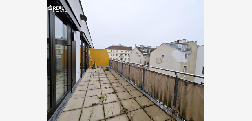 Sowohl das Wohn- als auch das Schlafzimmer bieten direkten Zugang zur langgezogenen Terrasse, die zusätzlichen Wohnkomfort im Freien ermöglicht. Durch die Situierung nahe Stiege 2 ist die Wohnung besonders ruhig gelegen. Sie befindet sich im 5. Liftstock (Dachgeschoss) und überzeugt dank ihrer