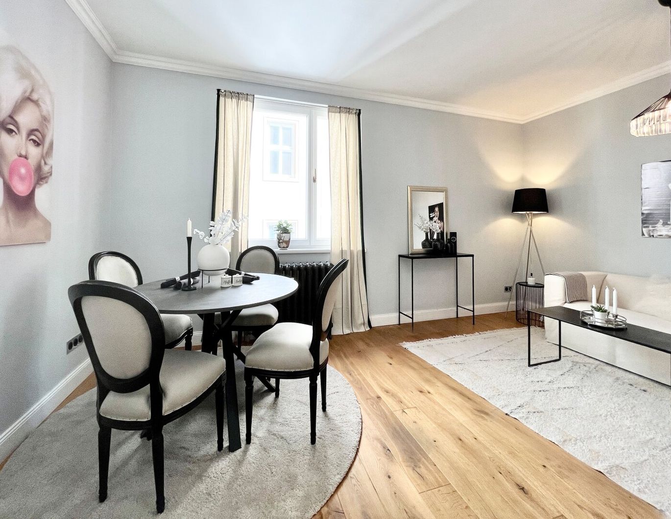 Herrlich-gemütliches Wohnzimmer mit Dielenparkett, Essbereich und Couch-Zone