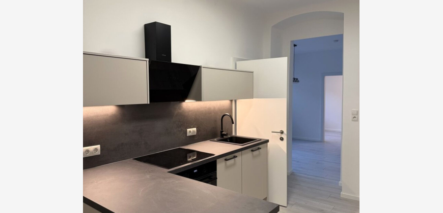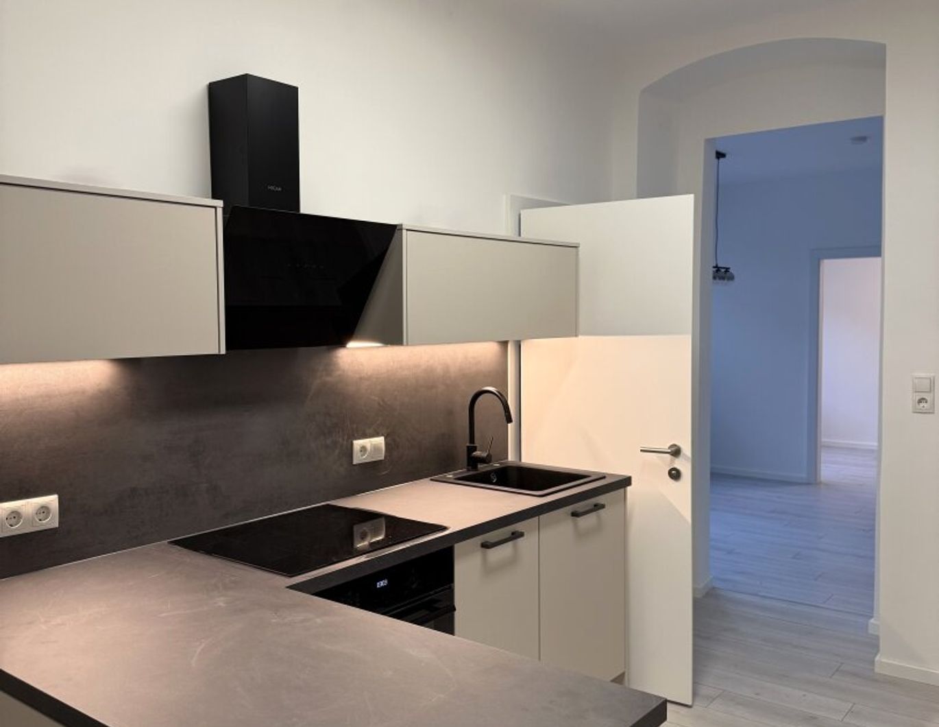 Neue, moderne Küchenzeile (Arbeitsplatte in Betonoptik) inkl. Ceranfeld, Spüle und Backrohr mit Dünstfunktion. Ein kleiner Geschirrspüler ist ebenfalls integriert.