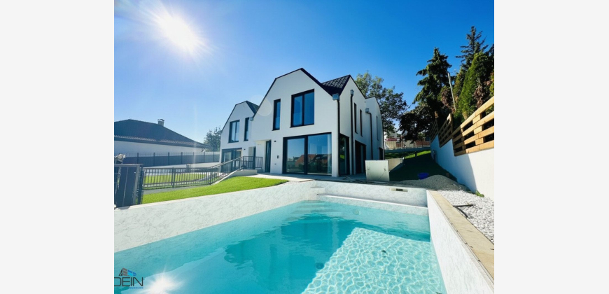Ausstattung : In den Wohn- und Schlafräumen wurden hochwertige Eichenparkettböden verlegt. Die Nassräume wurden mit qualitativen Feinsteinzeugbelägen verfliest. Die Fenster verfügen über einen integrierten Sonnenschutz. Jedem Haus sind zwei PKW-Stellplätze (Carport) zugewiesen. Die Heizung (Fußbodenheizung) erfolgt mittels einer energiesparenden Luftwärmepumpe. Eine Deckenkühlung gehört ebenfalls zum Standard. Jedes Haus verfügt über einen eigenen Swimmingpool. Die Küche ist inkl. sämtlicher Geräte ausgestattet.