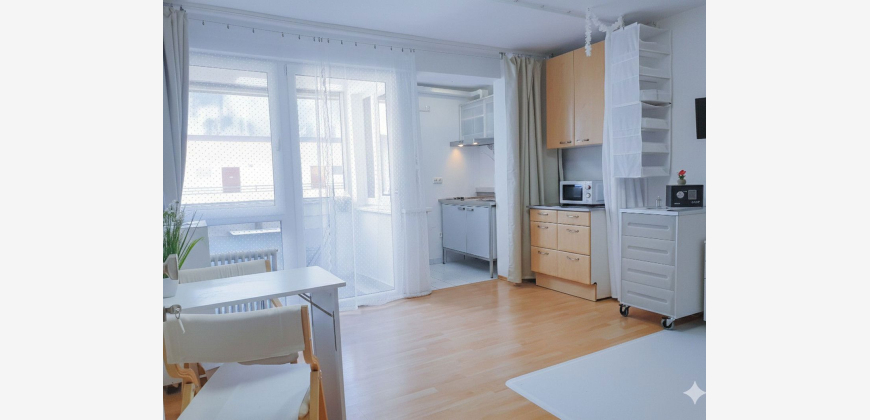 jedoch auch die Möglichkeit, vorübergehend eine zweite Person unterzubringen. Mittels blickdichter Vorhänge lässt sich der Wohnbereich flexibel und optisch ansprechend strukturieren, sodass bei zusätzlicher Nutzung ausreichend Privatsphäre gewährleistet bleibt. Die gesamte Einheit besticht durch eine helle, einladende Atmosphäre. Ein Balkon mit Blick in den ruhigen Innenhof mit Garten sowie auf die umliegende Bergwelt lädt zum Entspannen ein. Die Ausstattung ist nagelneu und perfekt auf die Bedürfnisse von Studierenden oder berufstätigen Pendlern zugeschnitten ("Komplettausstattung"). Die Highlights auf einen Blick: Zustand: Erstbezug nach hochwertiger Renovierung. Komplettausstattung: Vollmöbliert inklusive Küche, Geschirr, Bildschirm und mehr