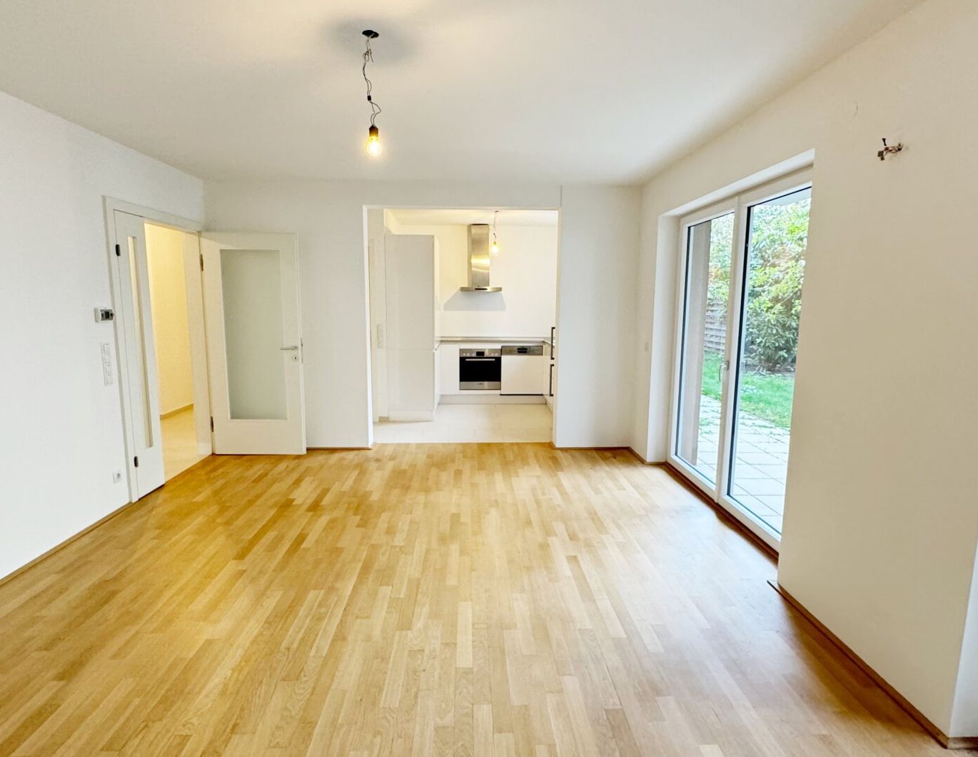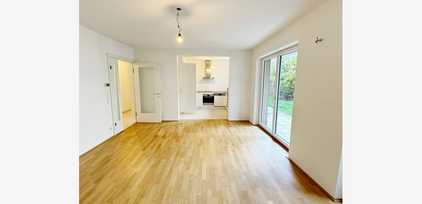 Das großzügige Wohnzimmer mit direktem Zugang zur Terrasse und dem privaten Garten ist nach Süden ausgerichtet. Hier können Sie gemütliche Stunden im Freien verbringen.