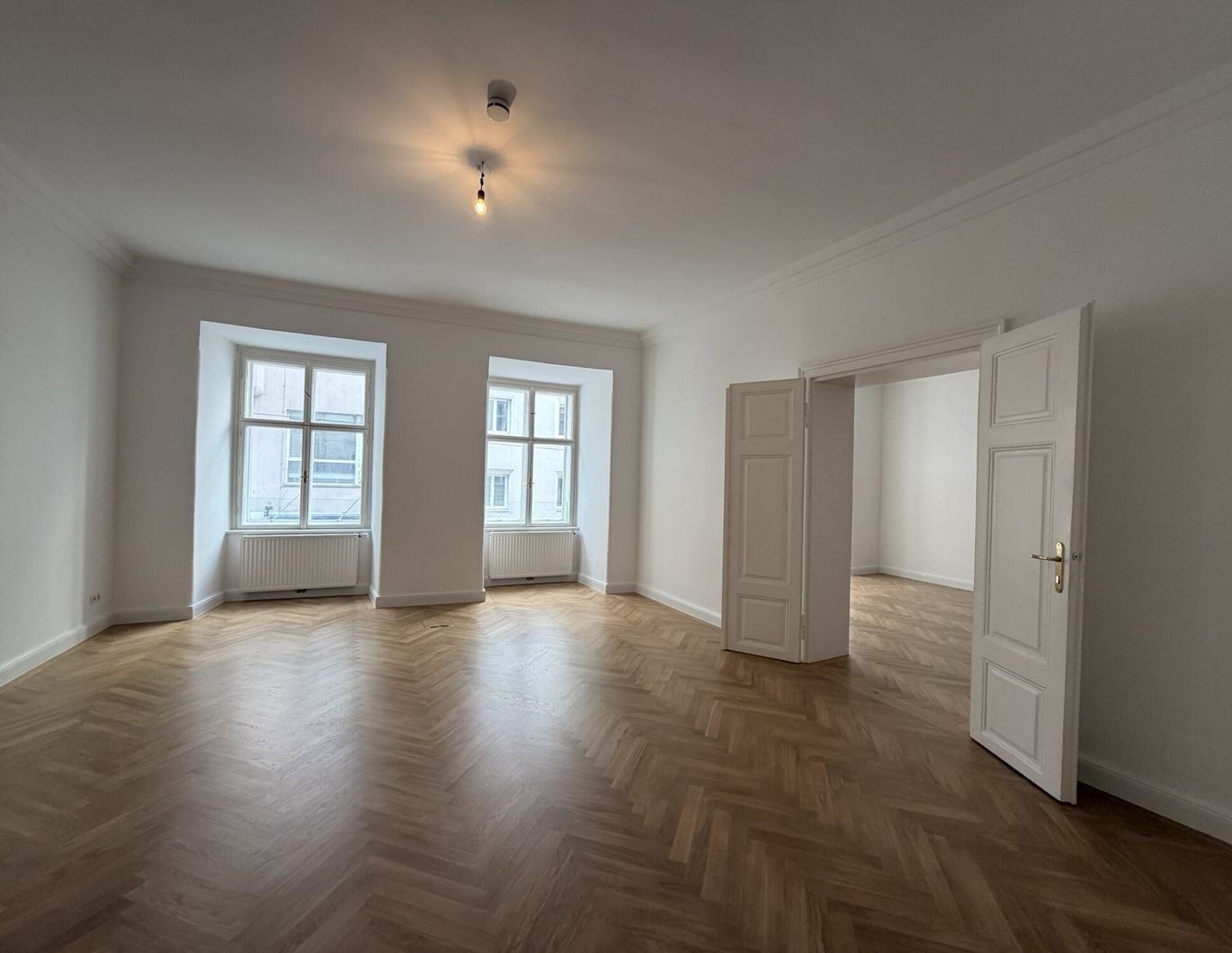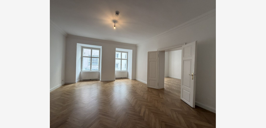 mit großzügigen Raumhöhen und hochwertigen Parkettböden. Die Einheit umfasst vier helle Büroräume, einen repräsentativen Empfangsbereich mit stilvollen Flügeltüren, einen separaten Besprechungsraum sowie eine Teeküche. Zwei der Haupträume sind straßenseitig zur Wollzeile ausgerichtet und bieten eine attraktive Sichtlage im Herzen von Wien. Die technische Ausstattung umfasst eine eigene Gasetagenheizung, einen separaten Server- bzw. Technikraum sowie eine vorhandene EDV-Verkabelung, wodurch die Fläche ideal für moderne Büroanforderungen geeignet ist. Getrennte Sanitäranlagen für Damen und Herren sowie ein Personenaufzug im Gebäude runden das Angebot dieser hochwertigen Bürofläche in zentraler Wiener Bestlage ab.