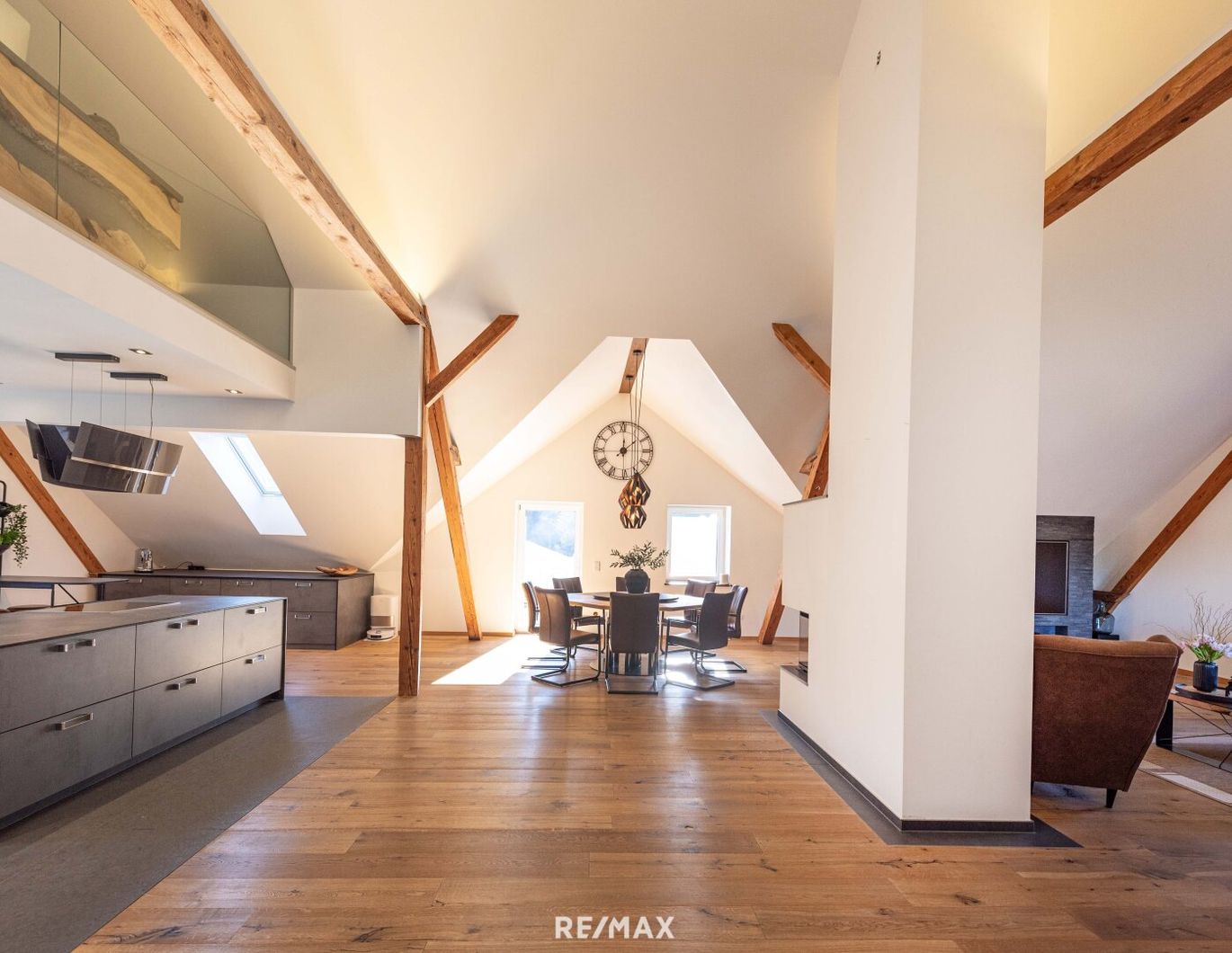 Das Dachgeschoss bildet das Herzstück des Hauses und beeindruckt durch ein offenes Wohnkonzept unter sichtbaren Holzbalken.