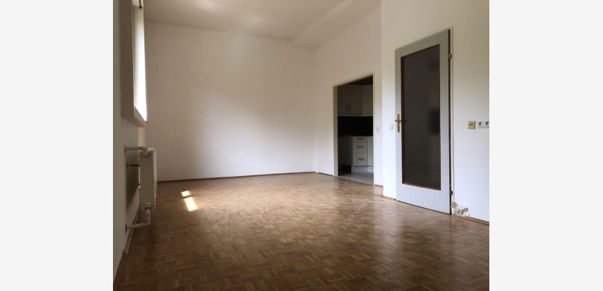 Sehr gepflegte, helle Wohnung in einstöckigem Mehrfamilienhaus (insgesamt 4 Wohnungen), bestehend aus einem großen Wohnzimmer mit Gartenblick, einer zum Wohnzimmer hin offenen Küche, einem Badezimmer mit großzügigem Duschbereich, einem separaten WC-Raum, einem Schlafzimmer, einem Vorzimmer. Der Parkettboden in den Zimmern wurde inzwischen abgeschliffen und frisch versiegelt (die Fotos zeigen noch den Zustand davor), die Zimmer sind frisch ausgemalt. Die Wohnung wird mittels zentraler Gasheizungsanlage beheizt. Ein eigener Kellerraum (15 m2) ist in der Miete inbegriffen.