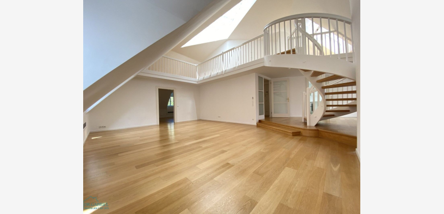 DISTRICT 1 / FREYUNG: COSY AND SUNNY DUPLEX APARTMENT IN HISTORIC BUILDING Entrance, living-dining-area, kitchen, bedroom with bathroom en suite and walk in closet, stairs leading from the living area to the upper floor: spacious gallery (e.g. home office, library) Wooden floors, fitted kitchen, cooling Der Immobilienmakler erklärt, dass er